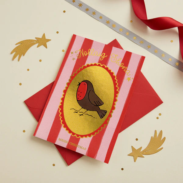 Celebrate the season with this charming festive greeting featuring an iconic robin, elegantly finished with shimmering gold foil detailing. Perfect for spreading holiday cheer to loved ones, this card captures the warmth and tradition of Christmas in a single, memorable design. A timeless choice for your seasonal correspondence.