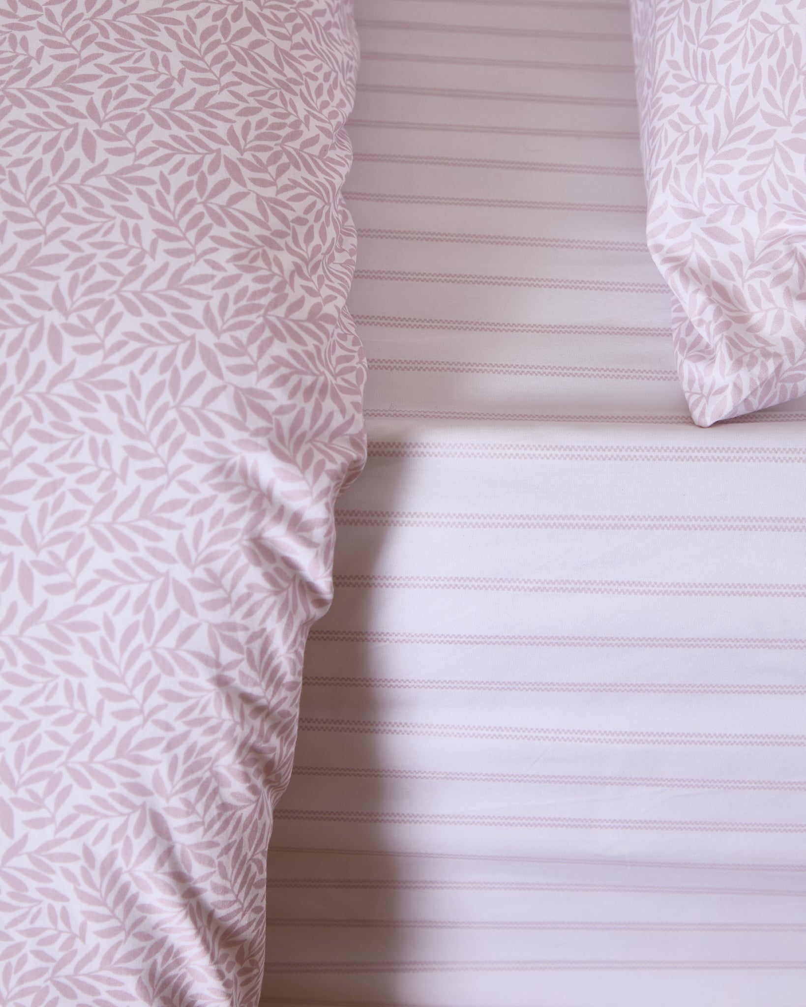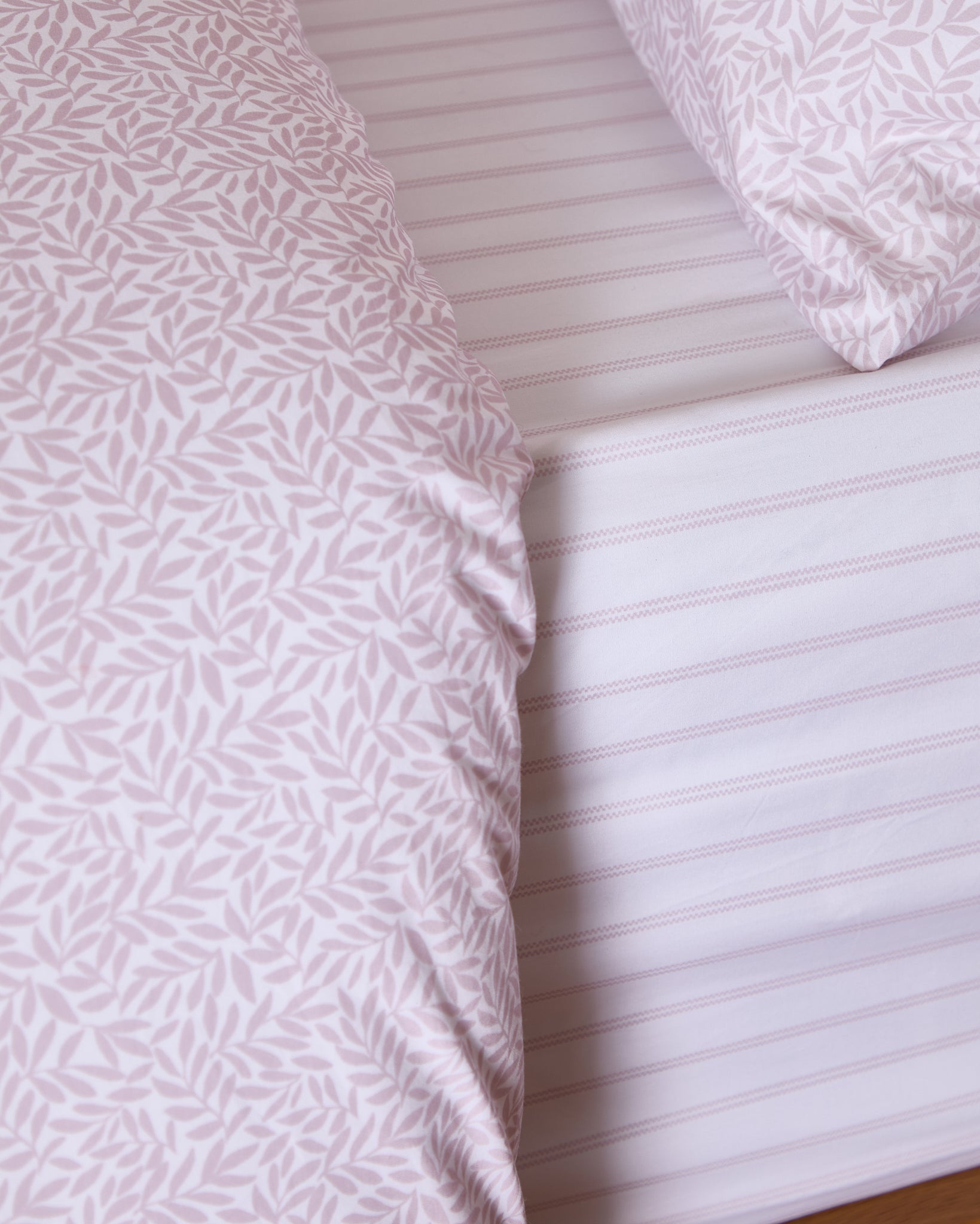 With a deep pocket for a secure fit, the Olivia Fitted Sheet in a delicate pink ticking harmonises beautifully with the fern design of the Olivia collection. Designed in Ireland and woven in Portugal, it embodies a blend of craftsmanship and timeless elegance.