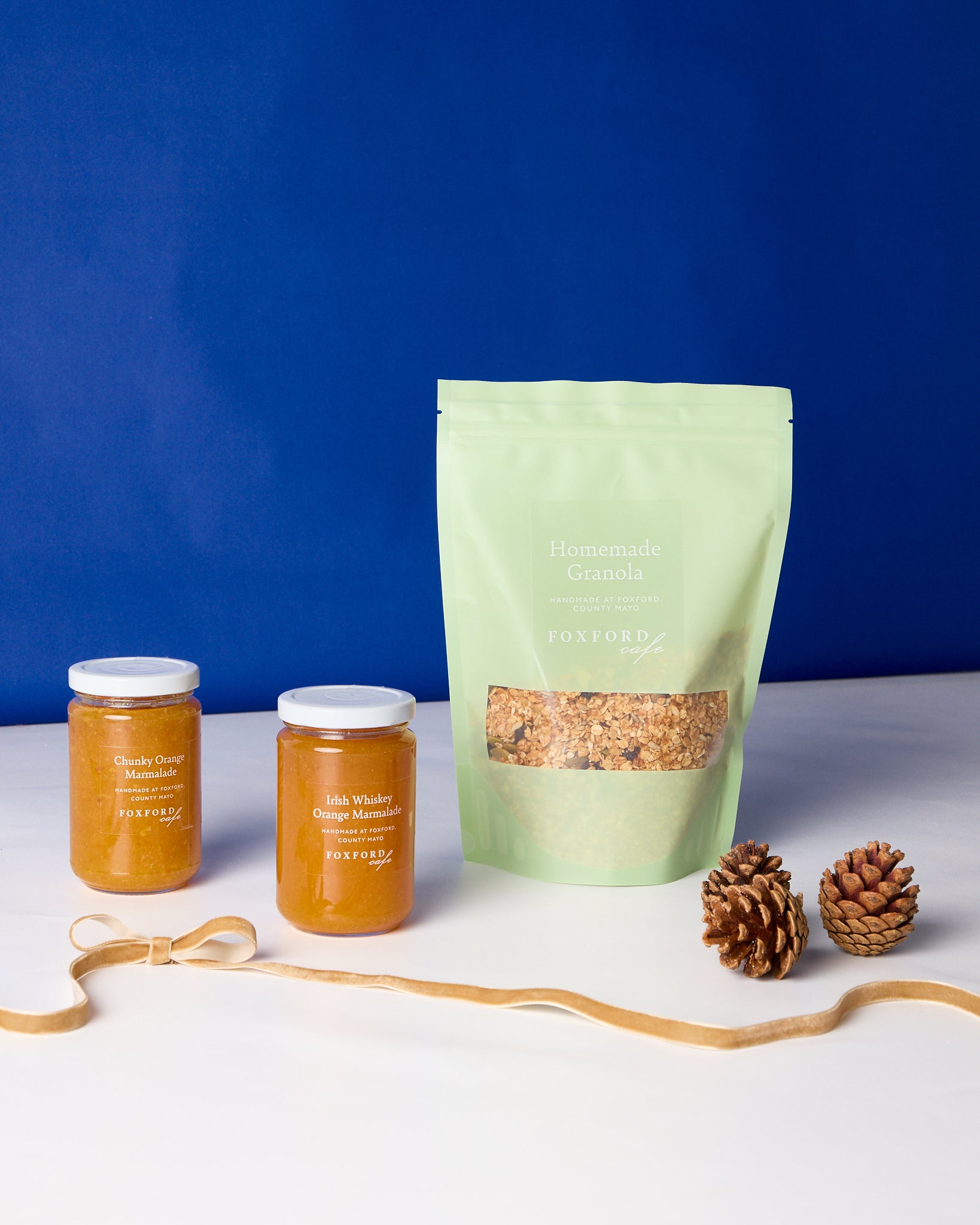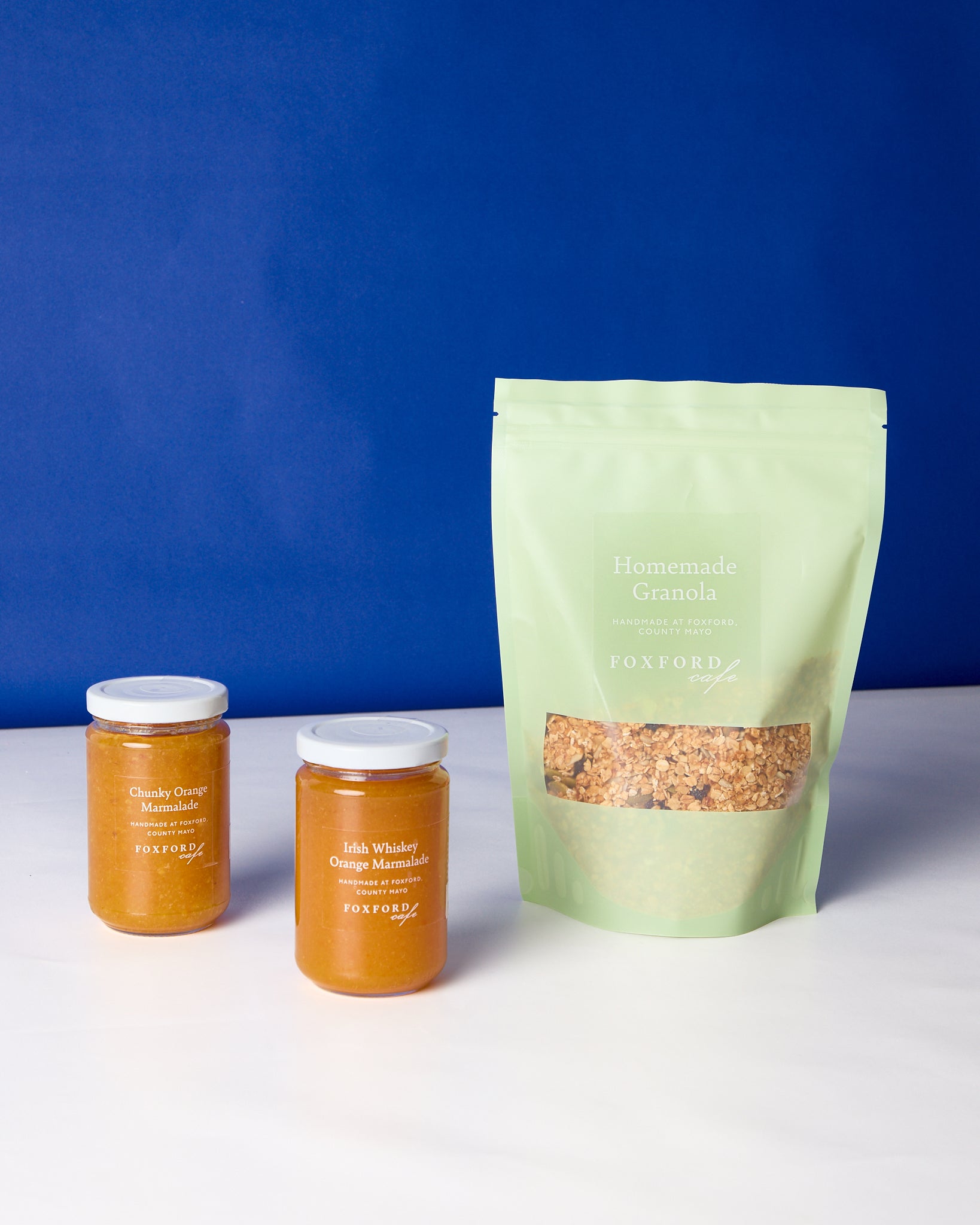 • A handcrafted breakfast trio from Foxford Cafe featuring Irish Whiskey Orange Marmalade, Homemade Granola, and Chunky Orange Marmalade – a perfect start to the day.