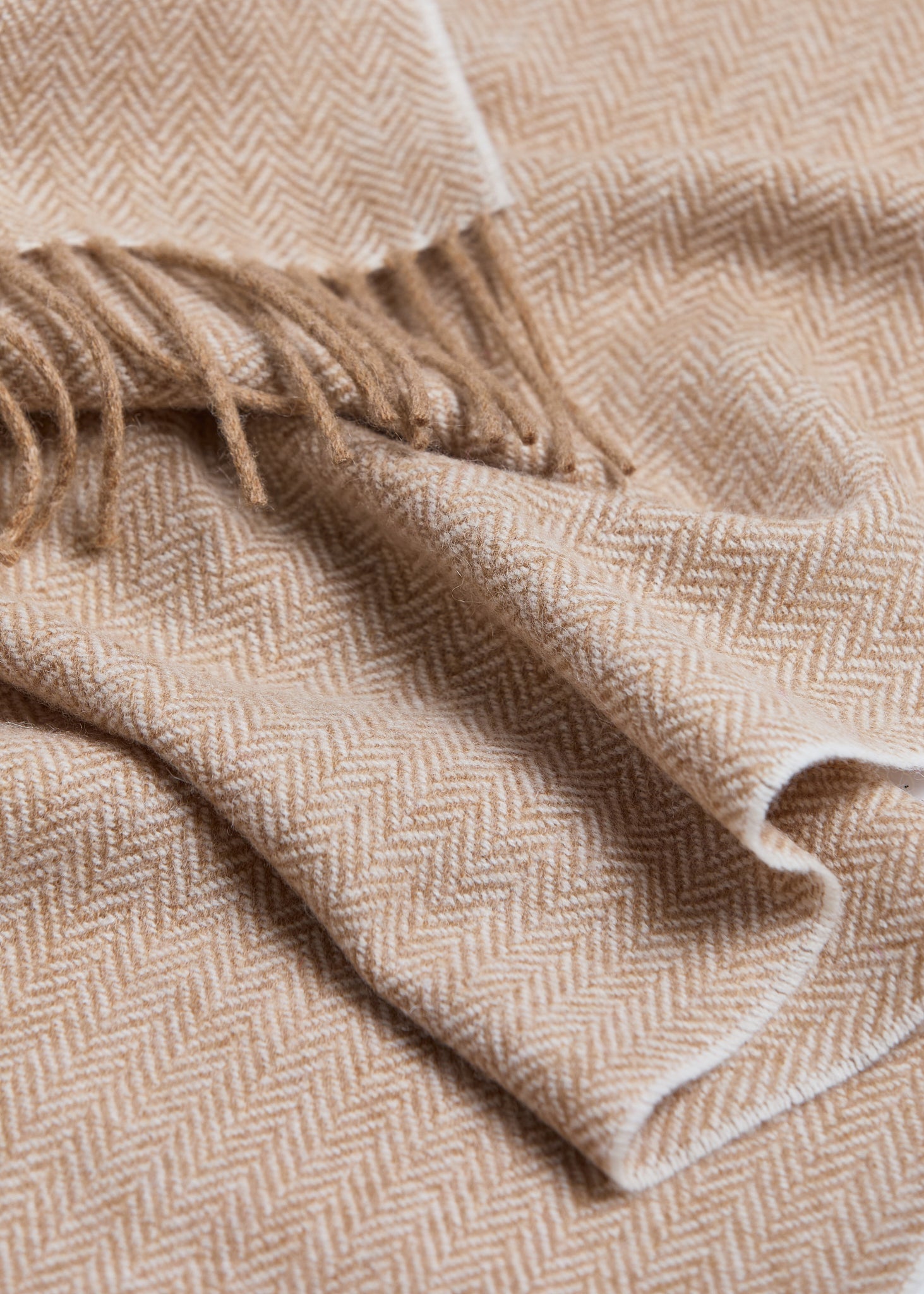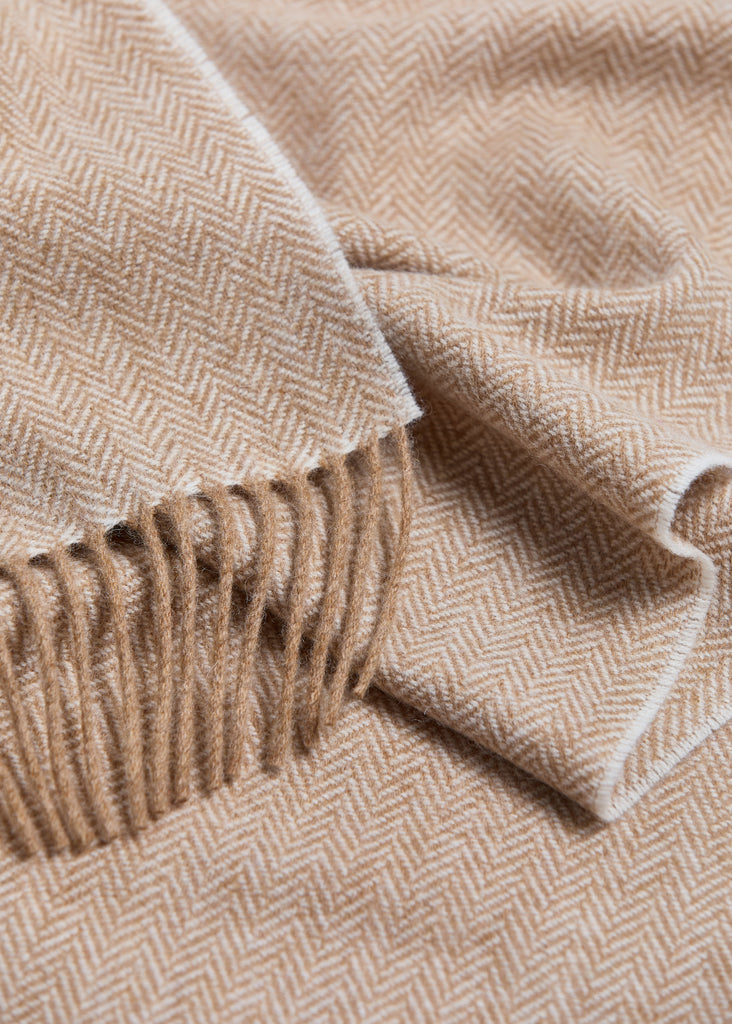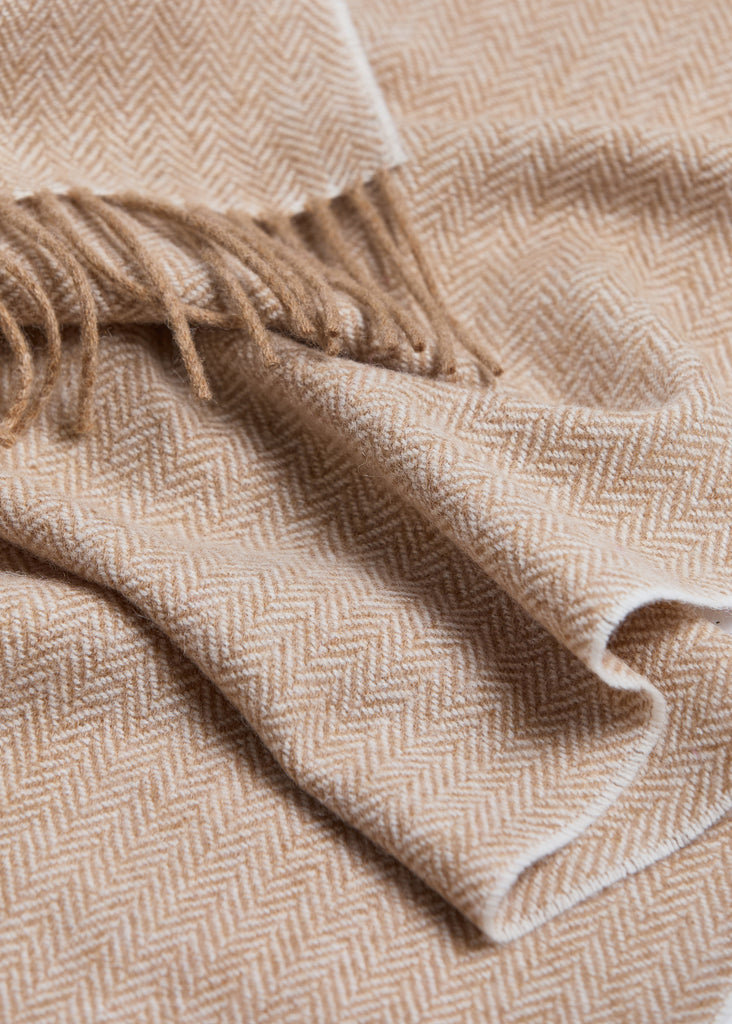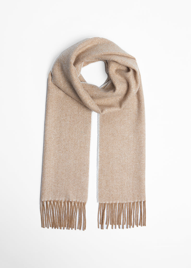 The Foxford Camel Herringbone Lambswool Scarf brings a touch of understated elegance to your wardrobe. Woven in Ireland from 100% lambswool, it combines warmth with a lightweight feel. It features a classic herringbone pattern in a rich camel shade. Ideal for layering, it provides both comfort and style. Delicate fringe detailing finishes this scarf for a timeless, versatile look.