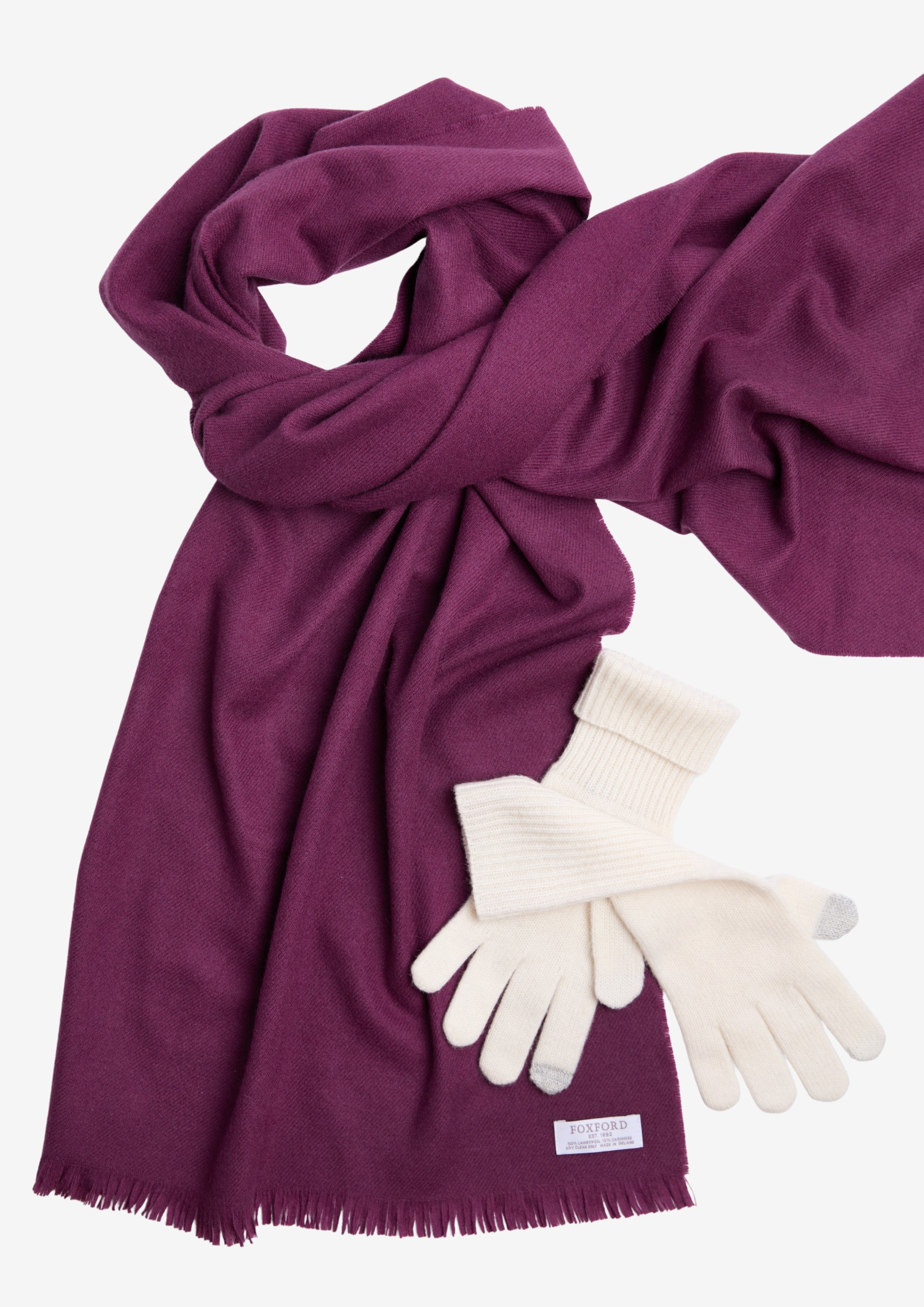 Foxford Fine Wool Cashmere Blend Scarf: 10% Cashmere 90% Lambswool. Gloves: 100% Cashmere