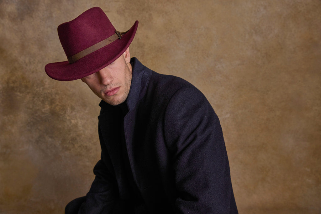 The Jack Murphy Boston Burgundy Water Repellent Wool Felt Hat expertly combines elegance and function for outdoor wear. Its timeless wide brim and teardrop crown shape provide durability and water resistance, while the crushable design maintains form during travel. Accented with a sophisticated leather band and a detachable Jack Murphy jockey pin, it offers subtle refinement. Offered in various sizes and five distinctive colours, this hat is sustainably produced with ethically sourced materials, making it a wise and enduring addition to any wardrobe. Its classic silhouette is crafted to perform stylishly in all conditions.