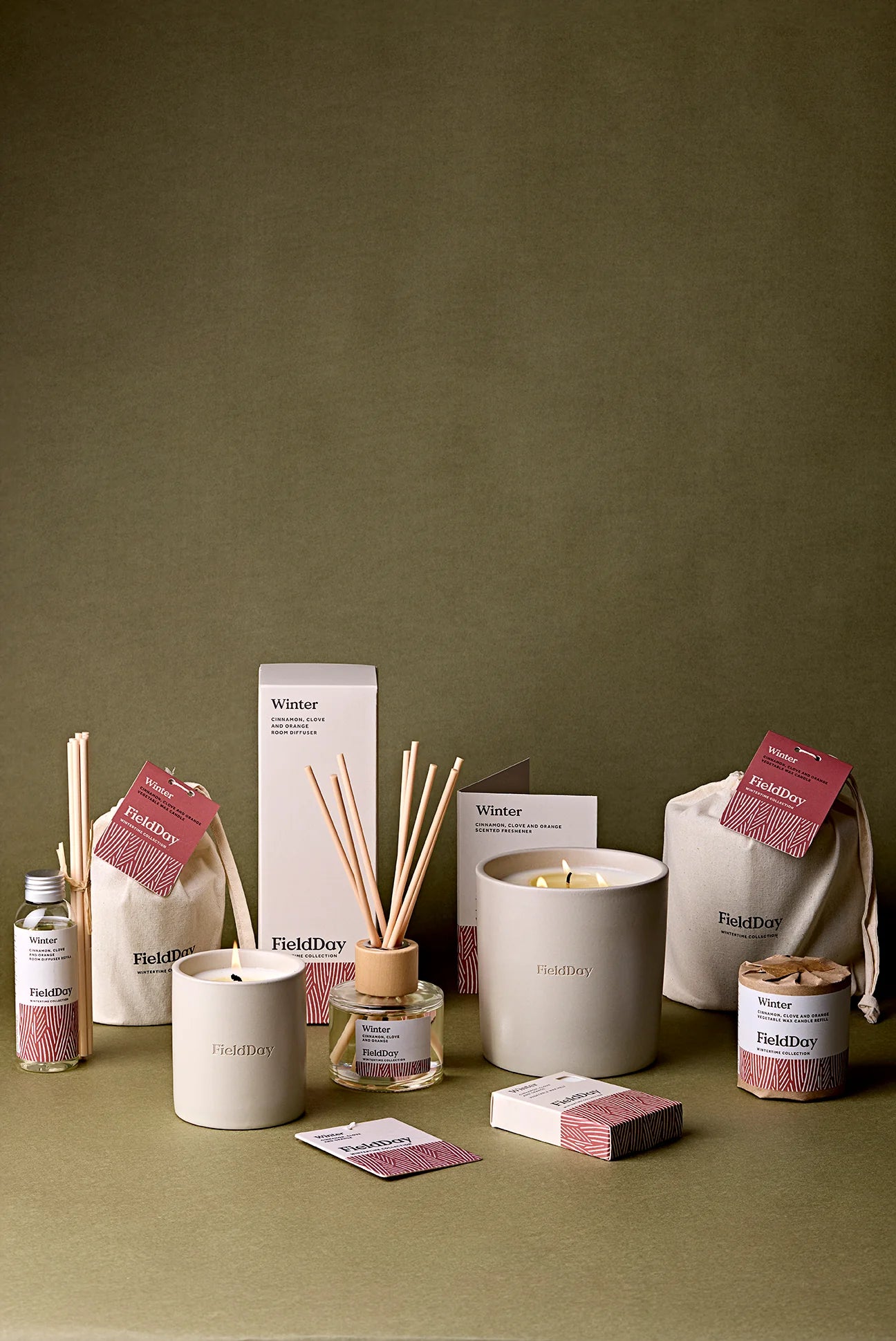 Our Winter Diffuser features an updated design, blending warm notes of cinnamon, clove, and orange. Encased in a glass jar topped with a wooden lid and paired with natural, unbleached reeds, it provides up to 10 weeks of continuous fragrance. Crafted using an eco-friendly solvent derived from renewable materials, this 100ml diffuser combines pleasant aromas with sustainability. It is vegan-friendly, cruelty-free, and packaged responsibly using vegetable-based inks.