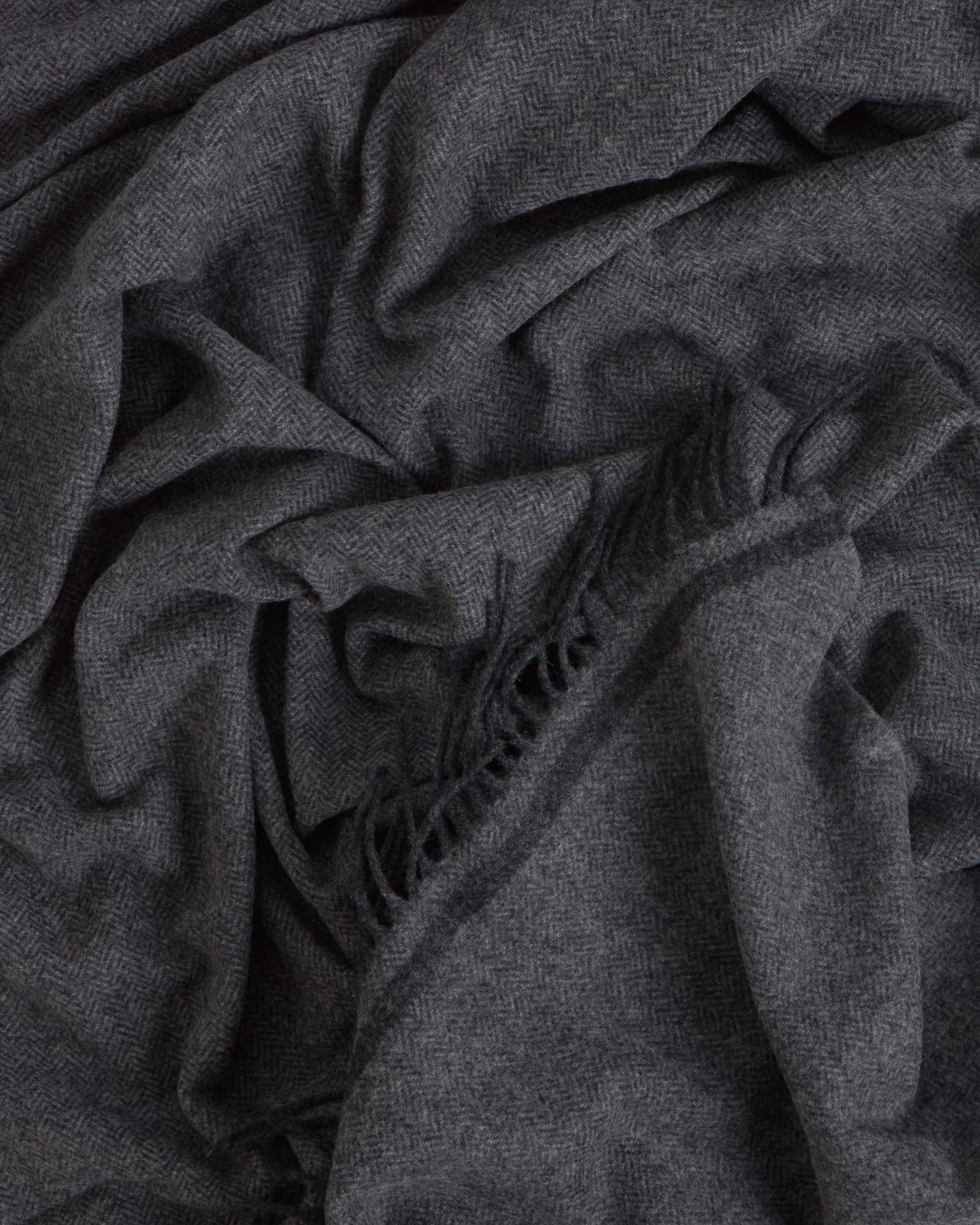 The soft charcoal grey weave is beautifully framed by a deep graphite striped edge and matching fringe, creating a rich accent that enhances sofas, armchairs, or beds.