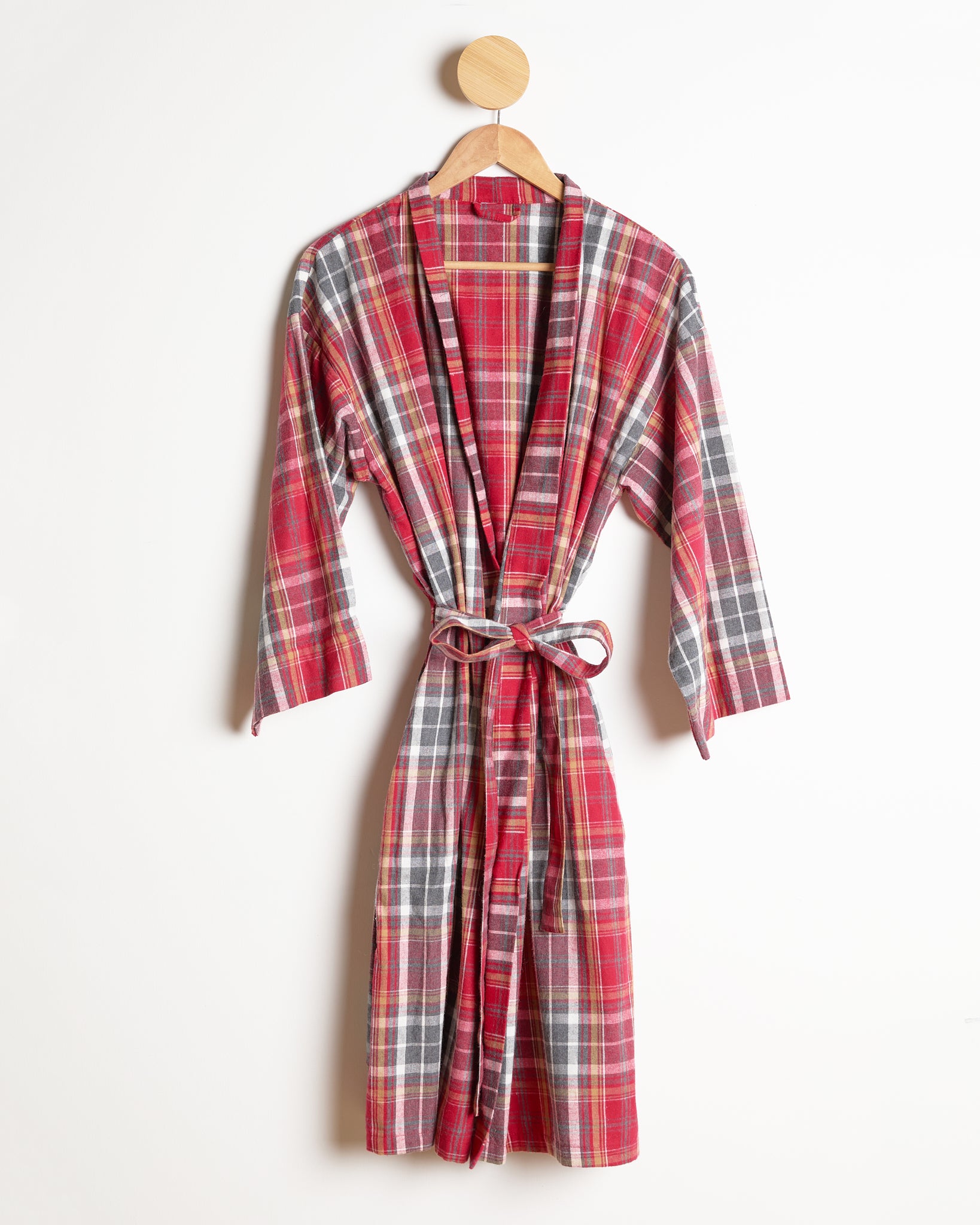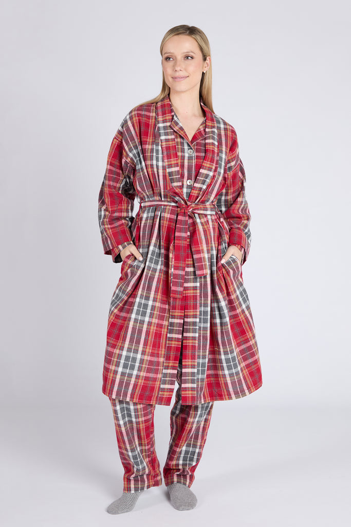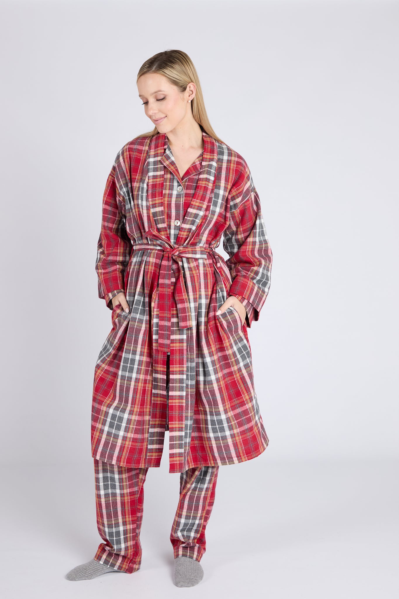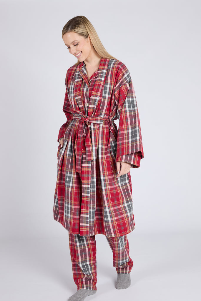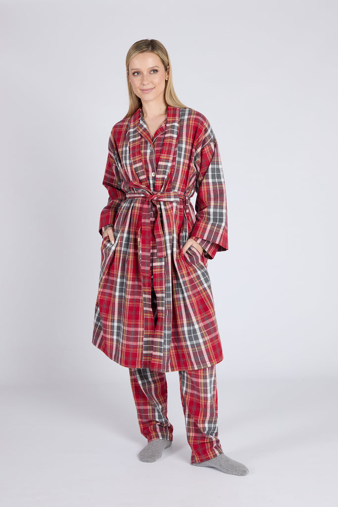 Wrap yourself in our red tartan kimono's warm and cosy comfort, perfect for long evenings and lazy mornings. Our Foxford Tartan Kimono is made from luxuriously soft flannel and finished with a matching belt and hanging loops at the waist. This soft robe is designed with traditional tartan checks that give these kimonoes a timeless charm.