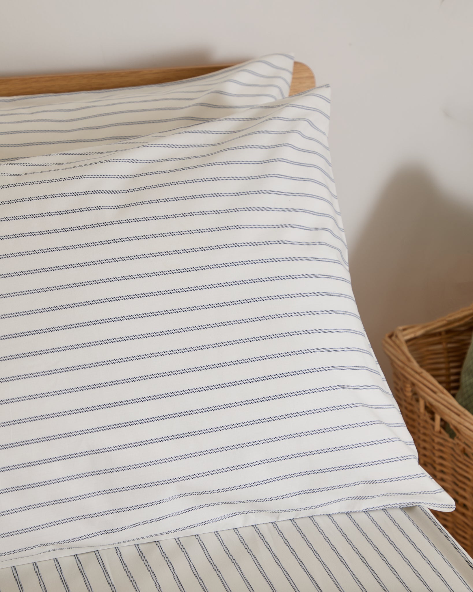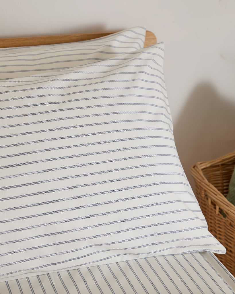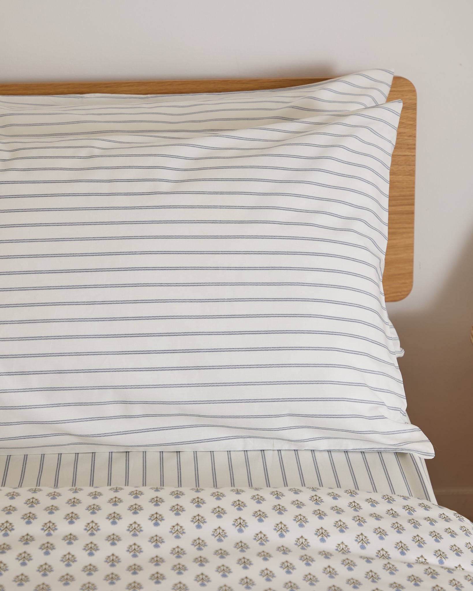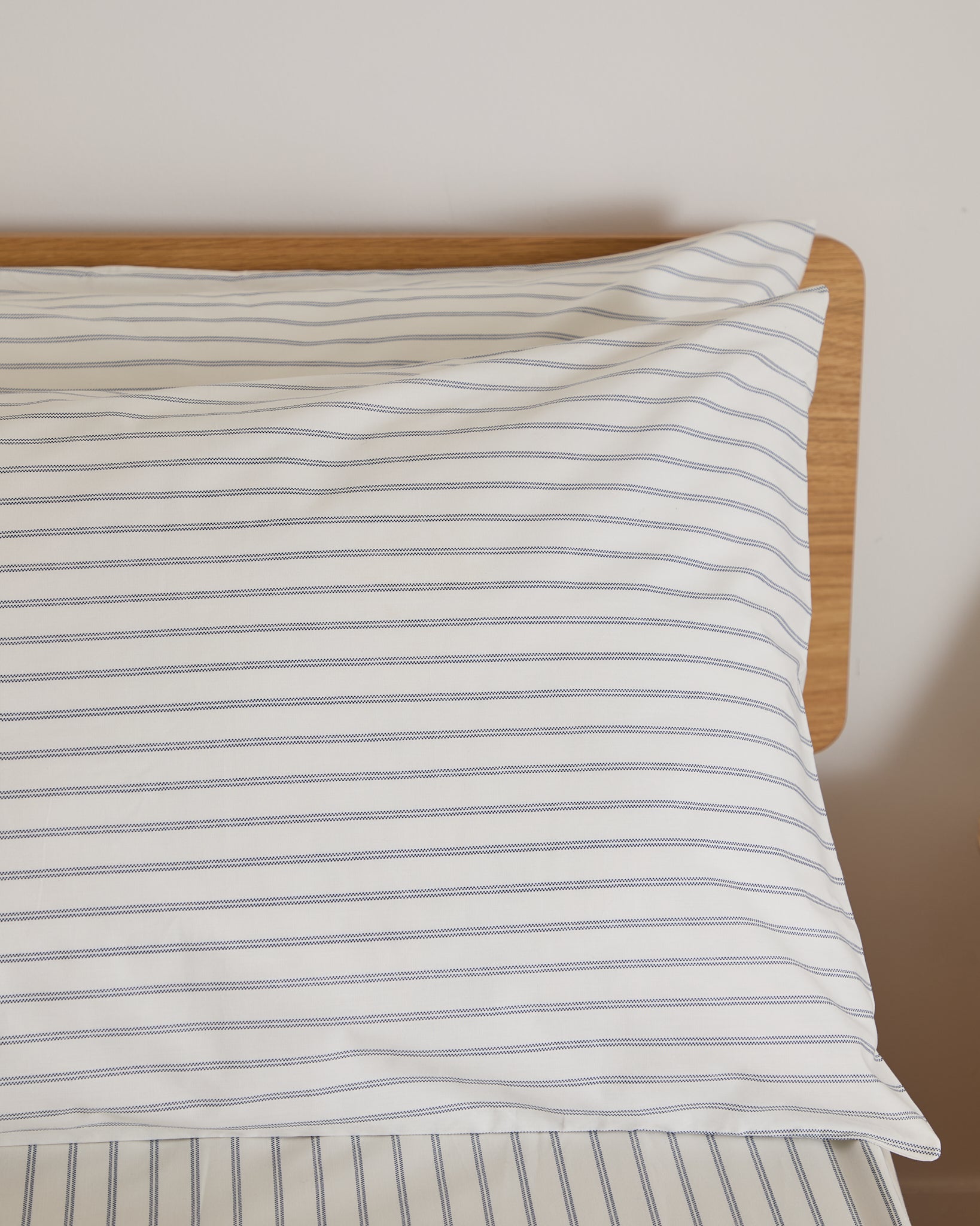 The Foxford Emma Pinstripe Pillowcase Set features a calm, rhythmic pinstripe pattern. Made in Portugal from 180-thread-count cotton, it offers a refined and soft feel. This set contains two pillowcases designed for maximum comfort.