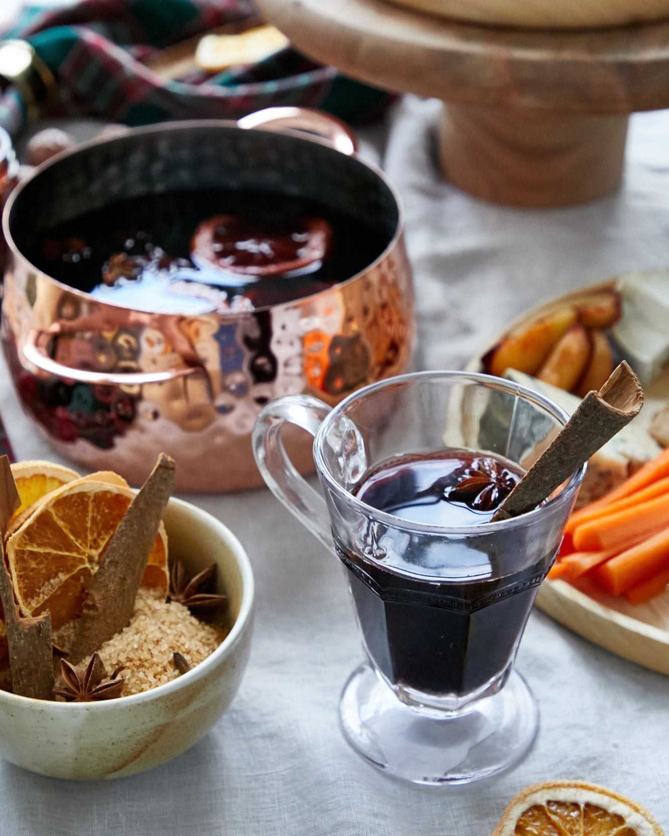 Add the whole mixture to a pot with two bottles of red wine. Warm the mixture gently to infuse the spices, but do not boil. Serve hot.