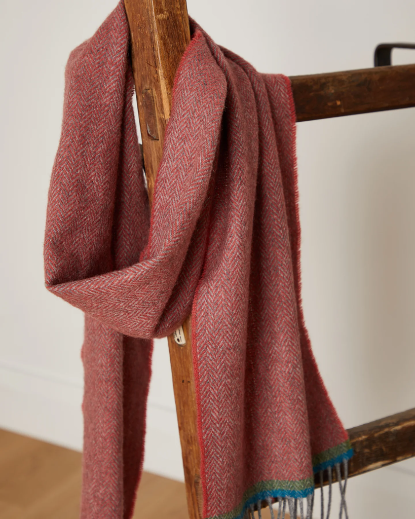 Expertly crafted using traditional weaving techniques, the Foxford Dearg scarf is a well-known design made from 100% lambswool. It is finished with a traditional roll fringe and features a rich tomato reds. This classic scarf in neutral grey-greens is the perfect addition to any wardrobe.