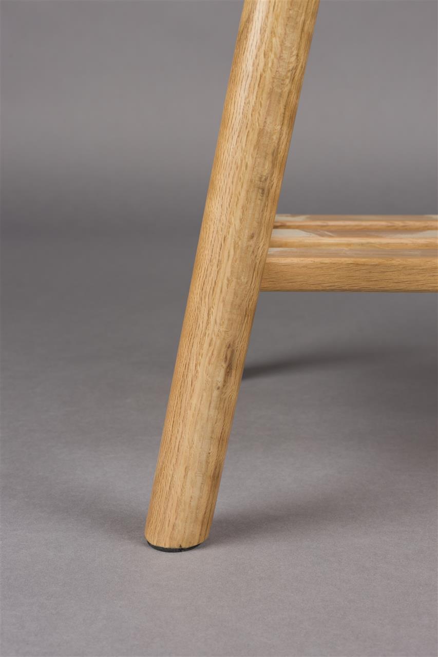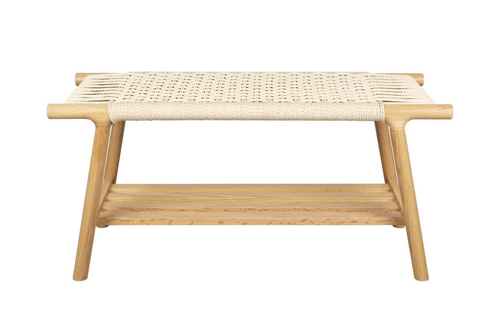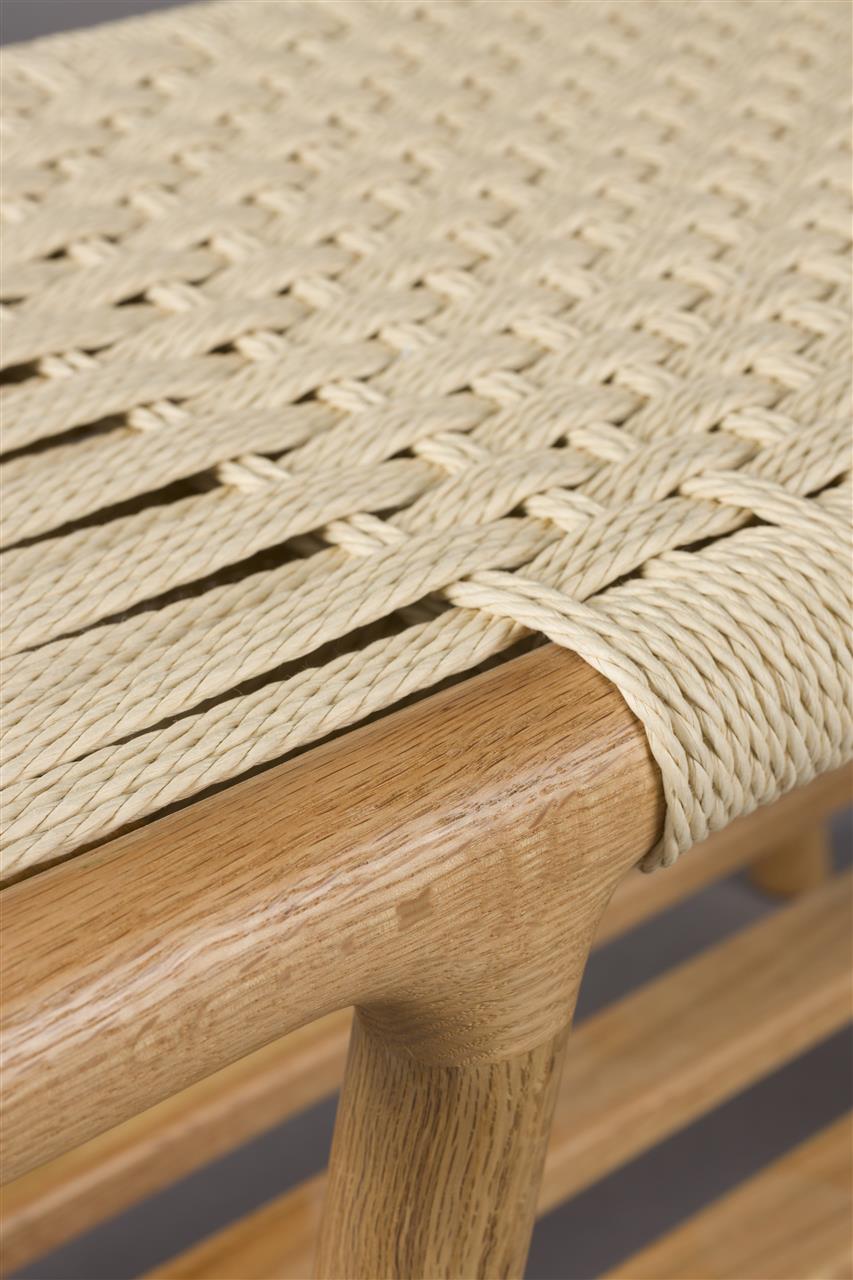 The real showstopper is its distinctive seat, made from horizontally and vertically woven rope that interlaces at the centre. Beneath the seat, the slatted shelf provides space for books, shoes, or other items.