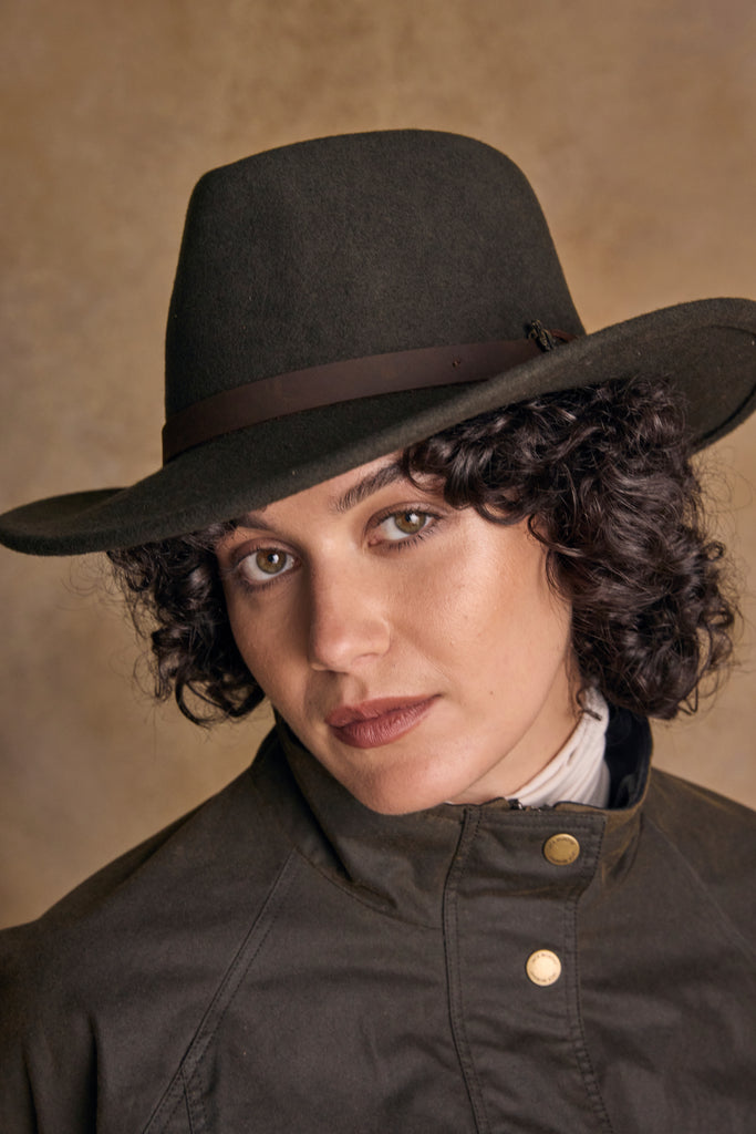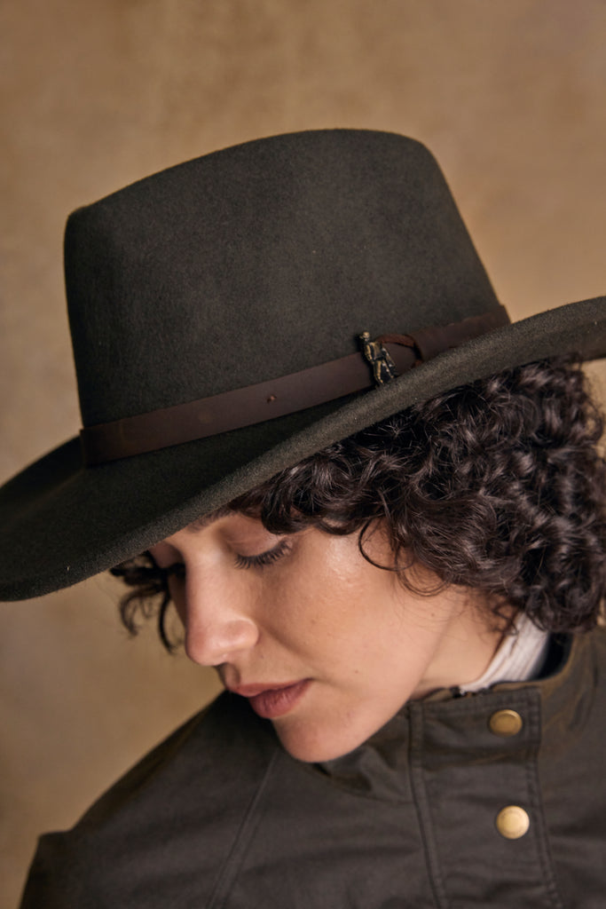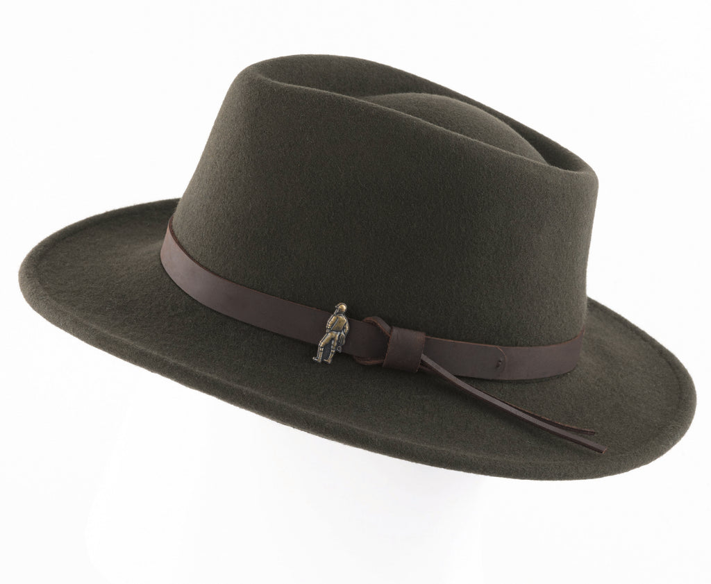 The Jack Murphy Boston Olive Water Repellent Wool Felt Hat seamlessly merges sophistication with practicality for outdoor wear. Its enduring wide brim and teardrop crown deliver lasting durability and water resistance, while its crushable construction preserves shape during travel. Enhanced by a sleek leather band and a removable Jack Murphy jockey pin, it adds a touch of subtle elegance. Available in multiple sizes and five distinct colours, this hat is crafted sustainably from ethically sourced materials, making it a thoughtful and lasting addition to any wardrobe. Its iconic silhouette is designed to offer stylish performance in all environments.