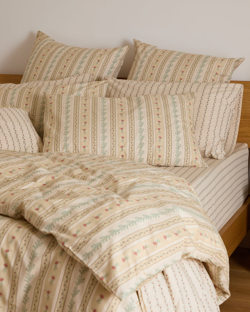 Crafted from soft 180-thread-count cotton, the Rose Pillowcase Stripe perfectly complements the Foxford Rose Duvet Set. Designed in Ireland and made in Portugal, it features a gentle rose pattern inspired by classic florals. Light, breathable, and smooth to the touch, it brings timeless elegance and everyday comfort to your bed.