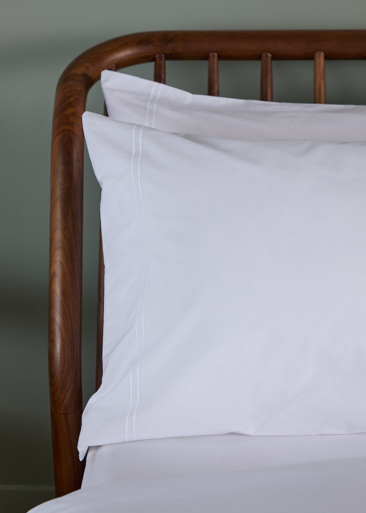 Floral patterned pillowcases on a bed with a wooden headboard.
