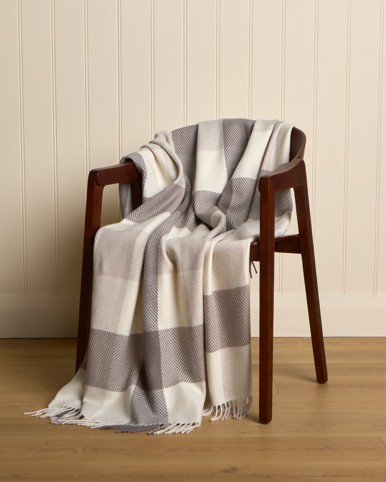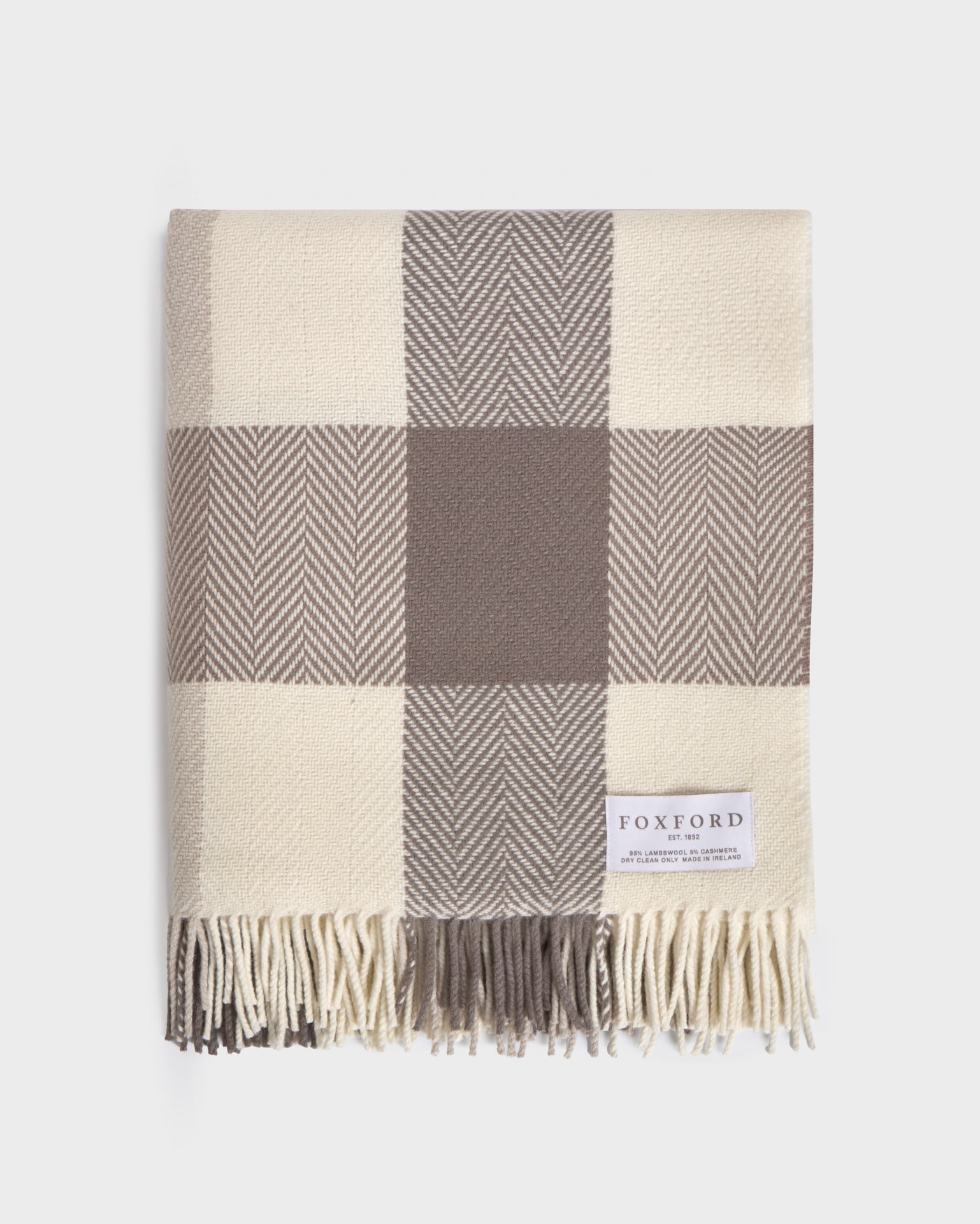 The FOXFORD Finn Throw- woven in our County Mayo mill, this blend of lambswool and cashmere wraps you in unparalleled softness while delivering lasting warmth. The soft block check pattern unfolds in a calming palette of warm cream, light beige, and subtle taupe.