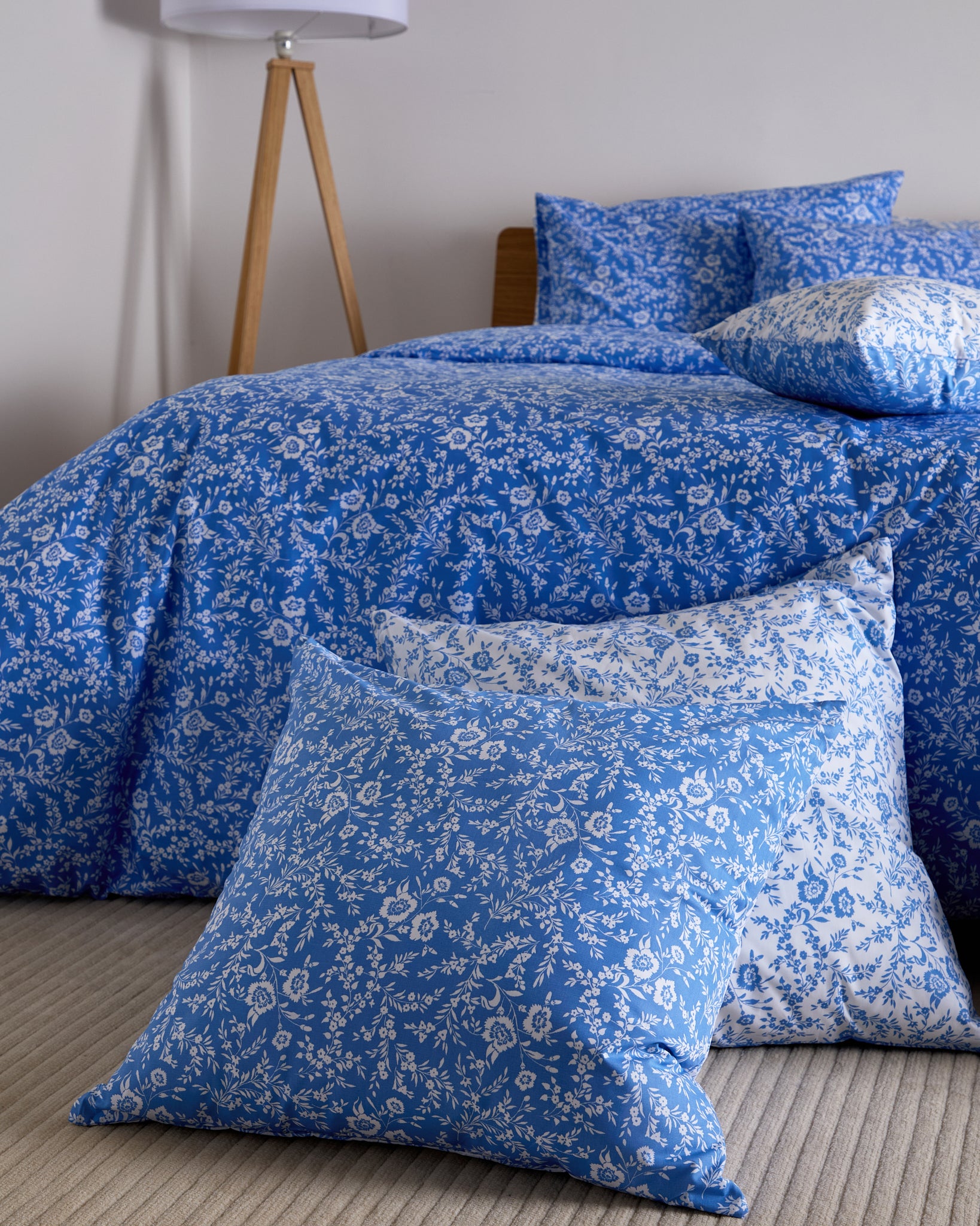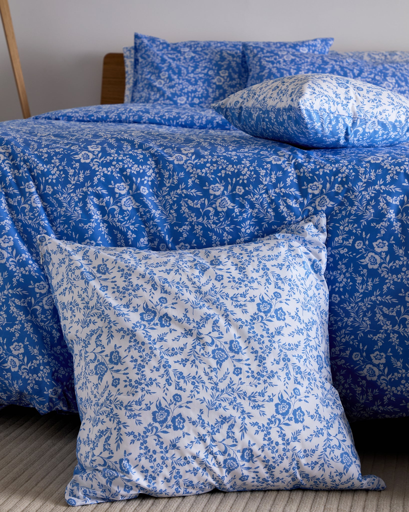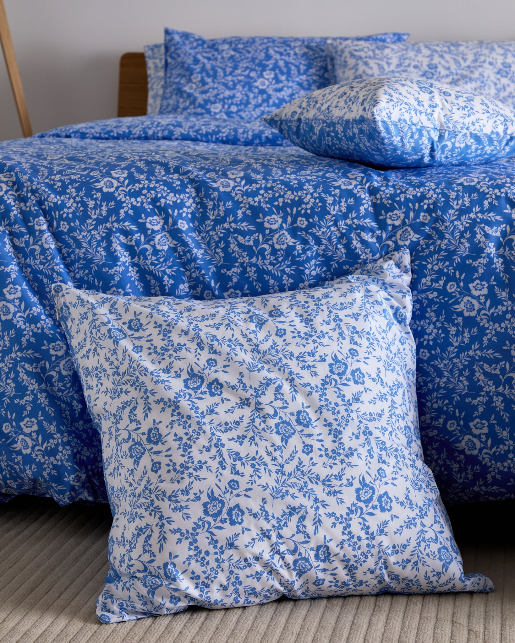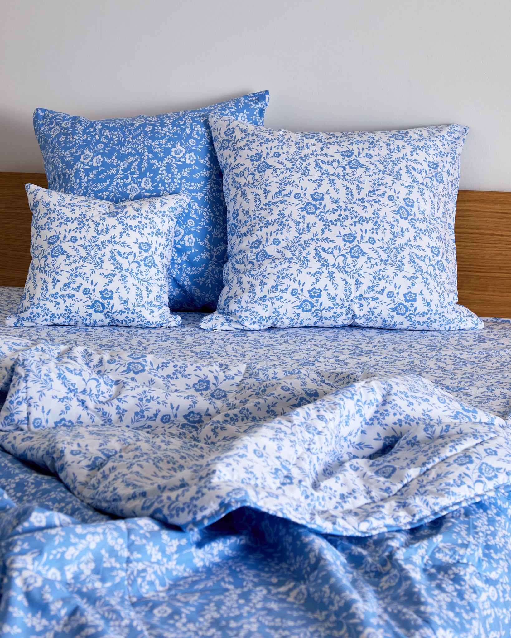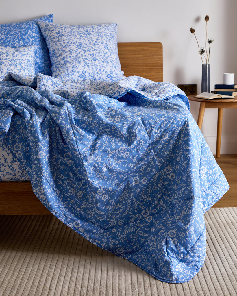 The Foxford Clara Cushion Large in a lighter shade of blue offers a gentle, calming touch to the Clara Quilt. Created by renowned designer Helen McAlinden, this design showcases delicate white wildflowers and adds a subtle touch of nature-inspired elegance. Made in Portugal from 100% cotton. The lighter blue hue creates a serene and inviting atmosphere in your bedroom.