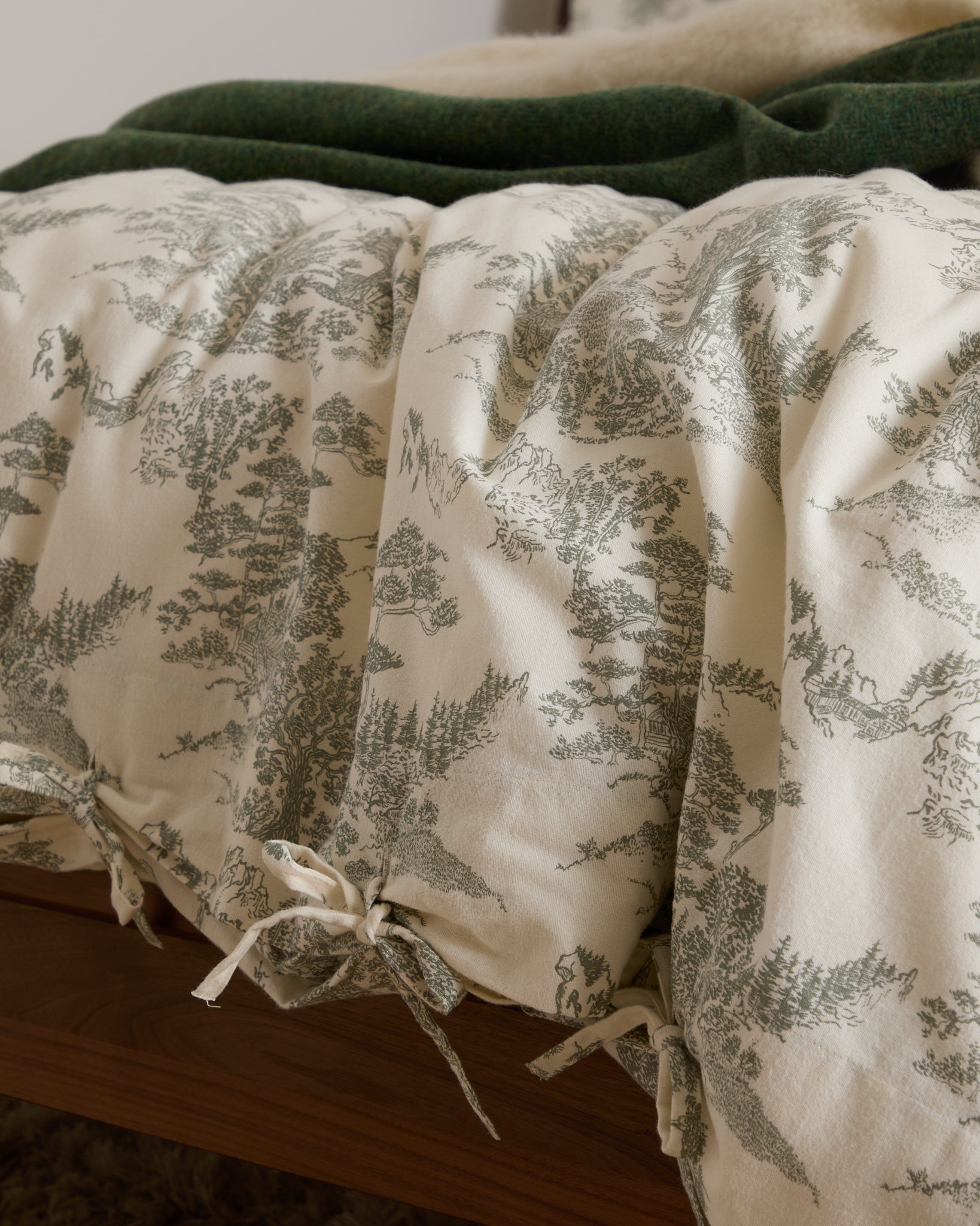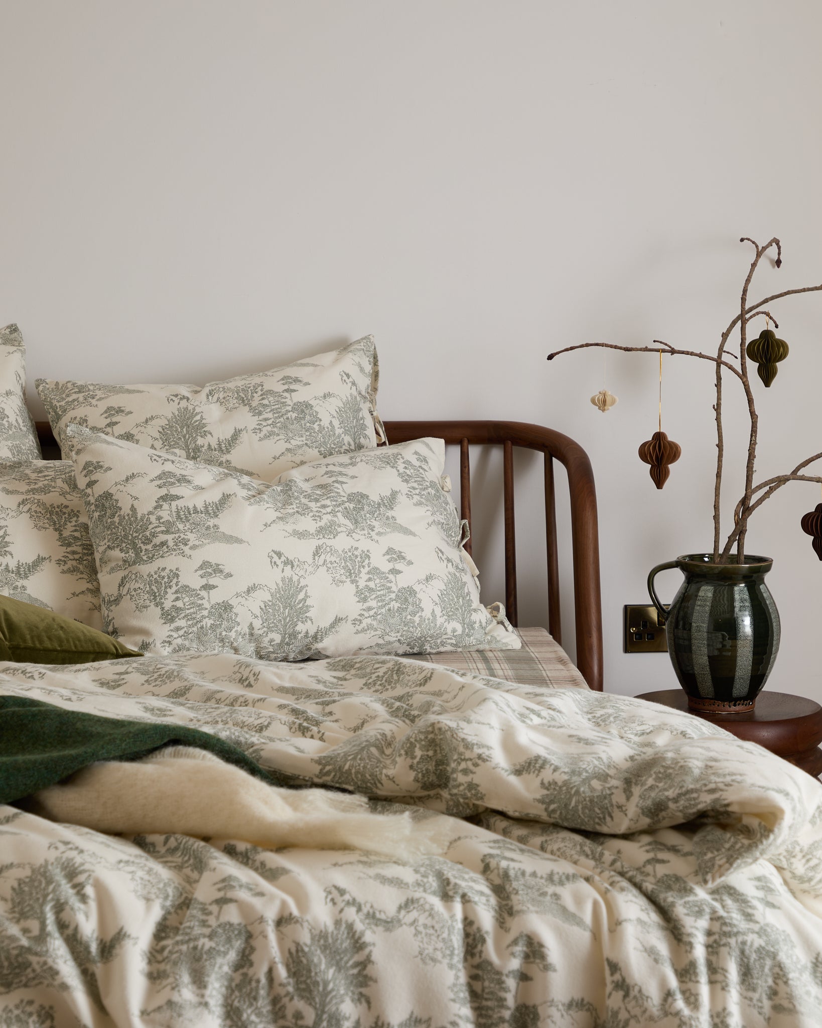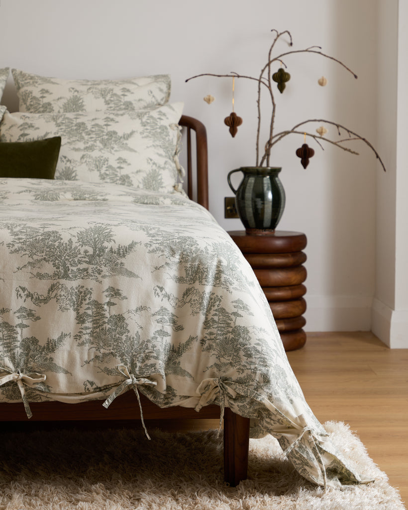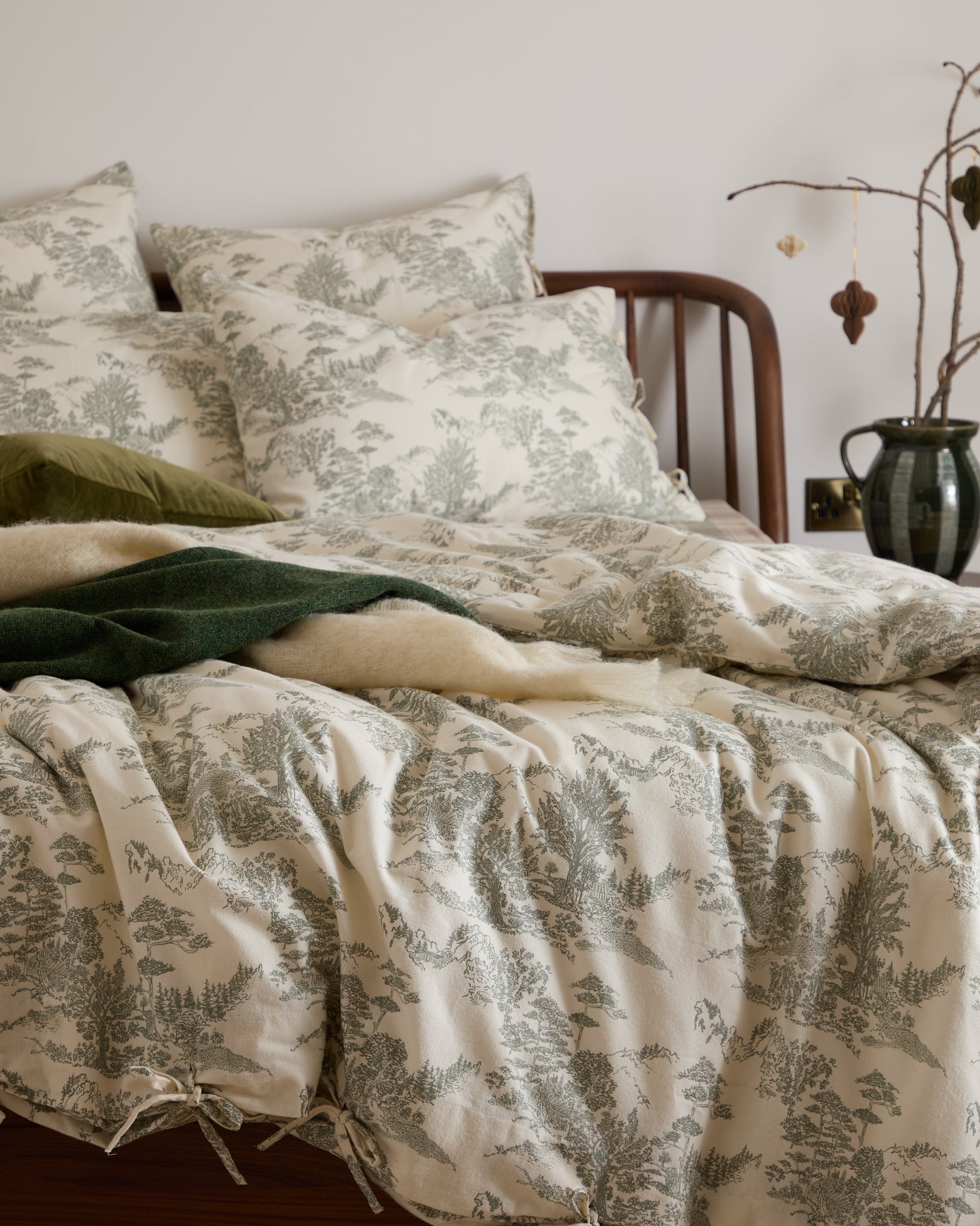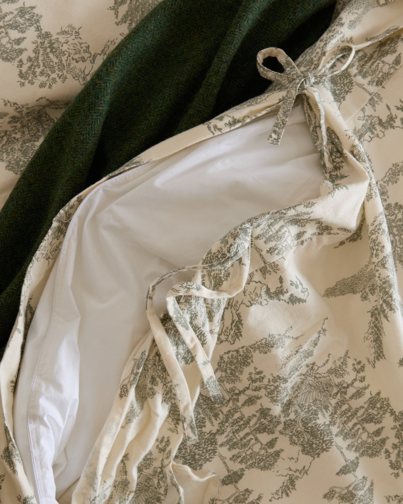 Woven in soft, brushed flannel for the colder months, the Eve Toile Flannel Duvet Set brings warmth and seasonal charm to your bedroom. Designed in Ireland, the Eve Toile features delicate Irish scenery in a rich green, offering a timeless nod to heritage style. With elegant details such as tie fastenings, the Eve Toile Flannel Duvet Set brings a sense of charm to any bedroom.