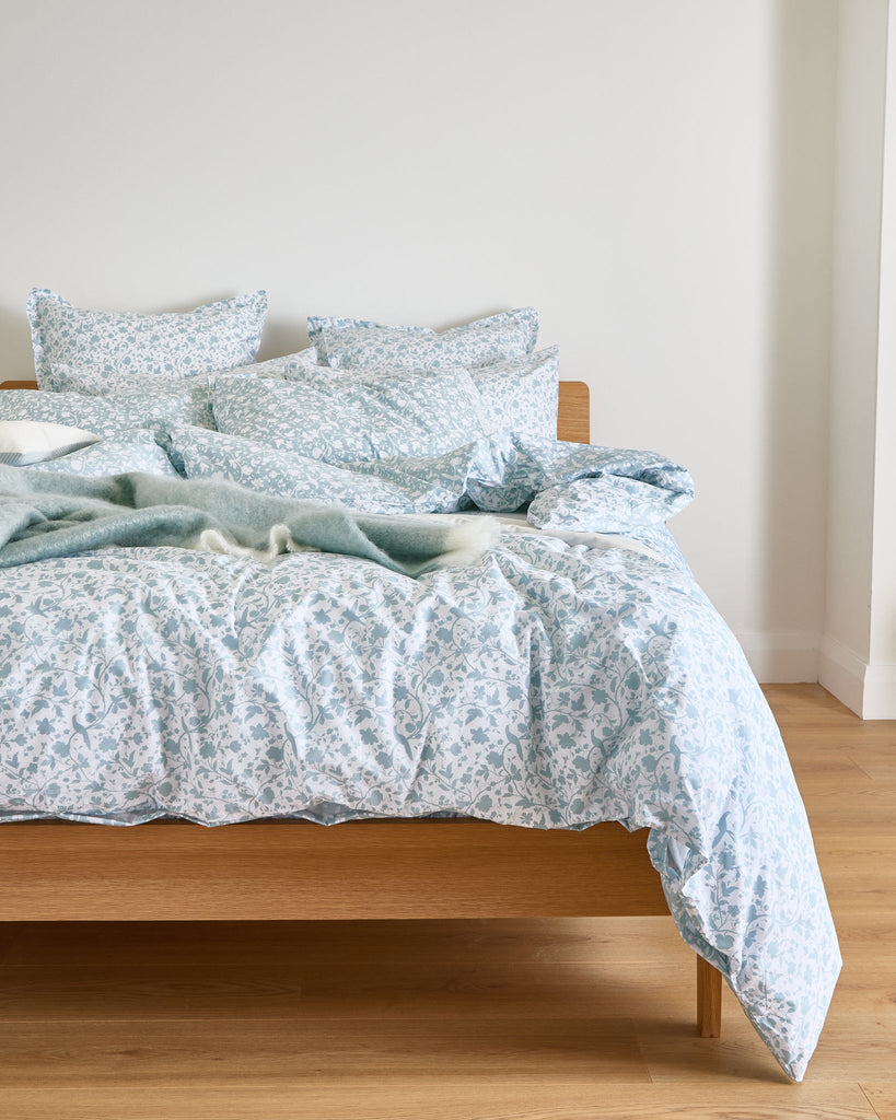 Experience true luxury with the Foxford Romantic Blossom print. This sophisticated cushion, created by renowned Irish designer Helen McAlinden, features a serene blue floral pattern that will elevate your bedding assortment. It is the latest addition to our 2024 summer collection, ensuring exceptional quality and comfort, as is customary with all our bedding products. Pair it with the Garden Bouquet Duvet Set and Quilted Blanket for an impeccable bedding ensemble.
