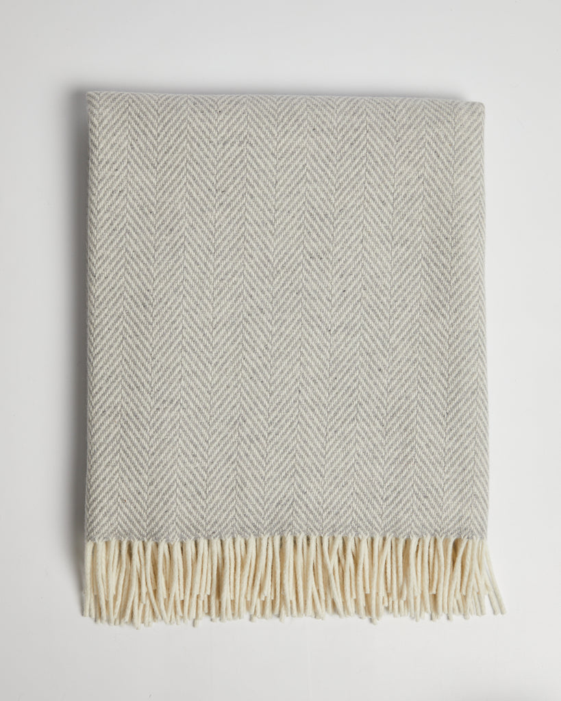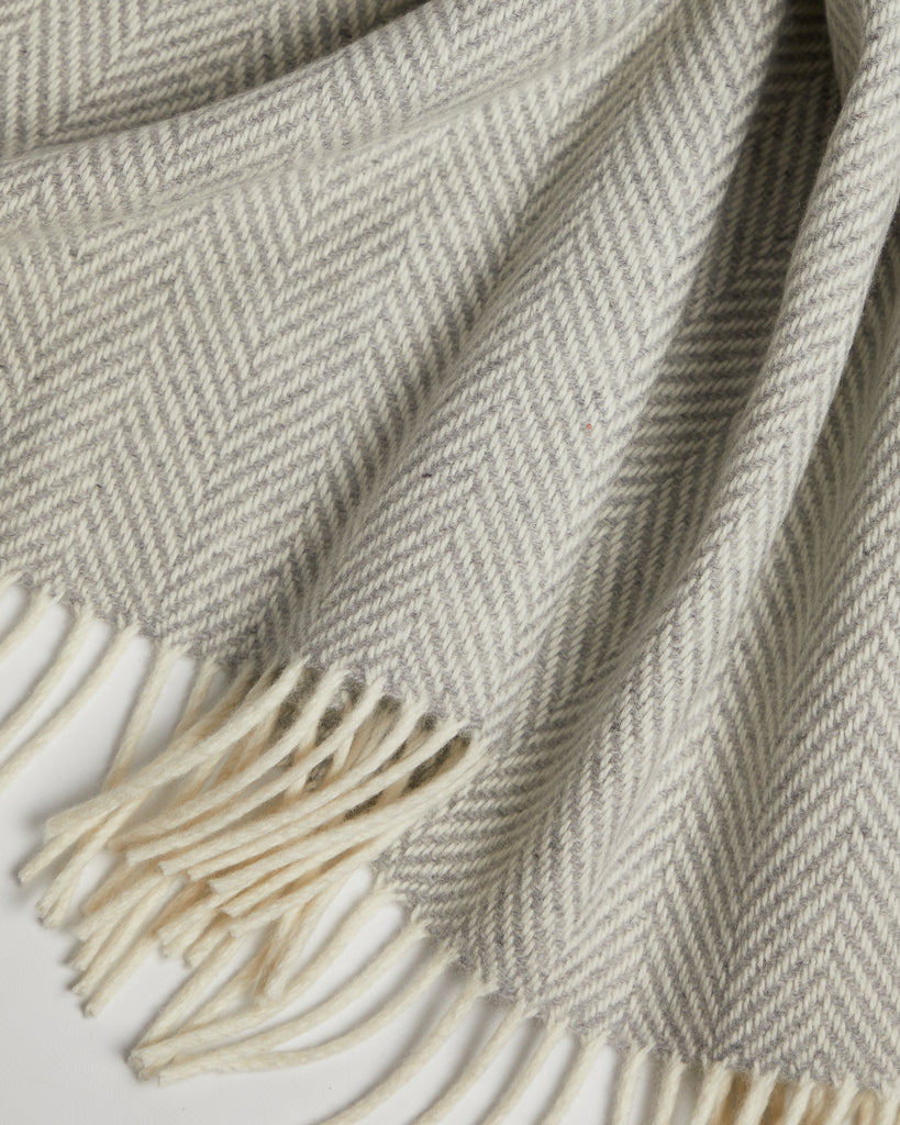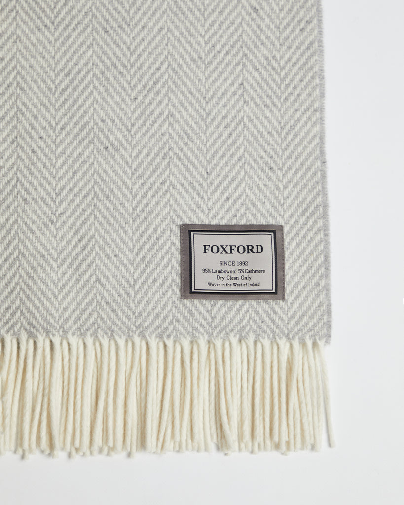 Named after a mountainous island just off the coast of our home county, the Clare Island Throw is woven in a subtle grey and cream herringbone style, with a traditional roll fringe at the edges. Each throw is expertly crafted in our FOXFORD mill using a warm blend of cashmere and lambswool for the highest quality finish.