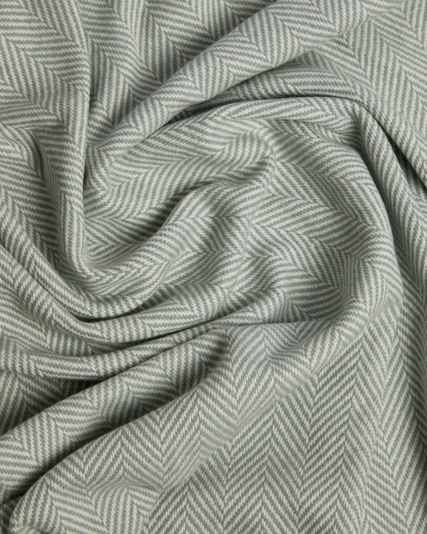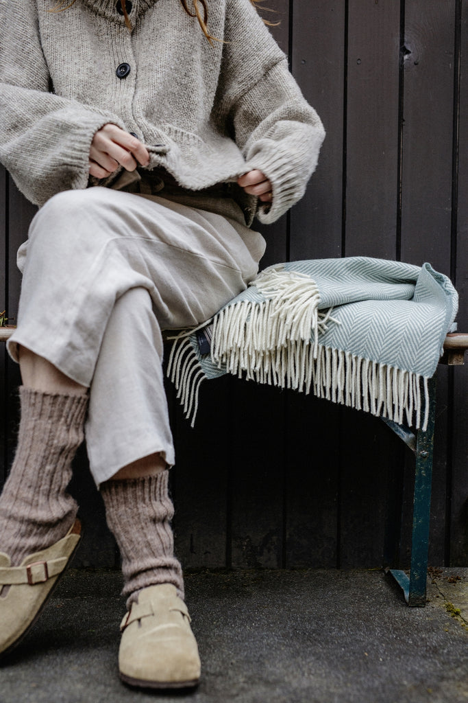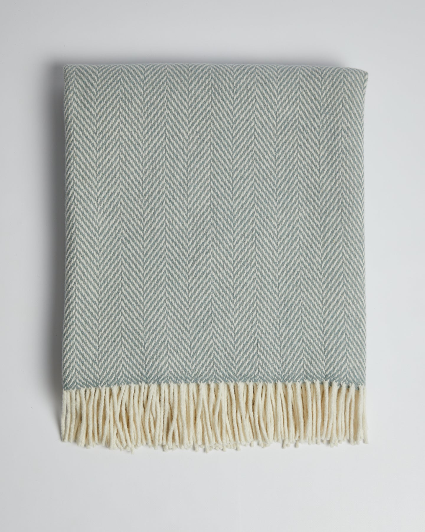 Named after the beautiful and historical island just off the coast of our home county, the Achill Throw is woven in subtle sage and white herringbone, with a traditional roll fringe at the edges.
