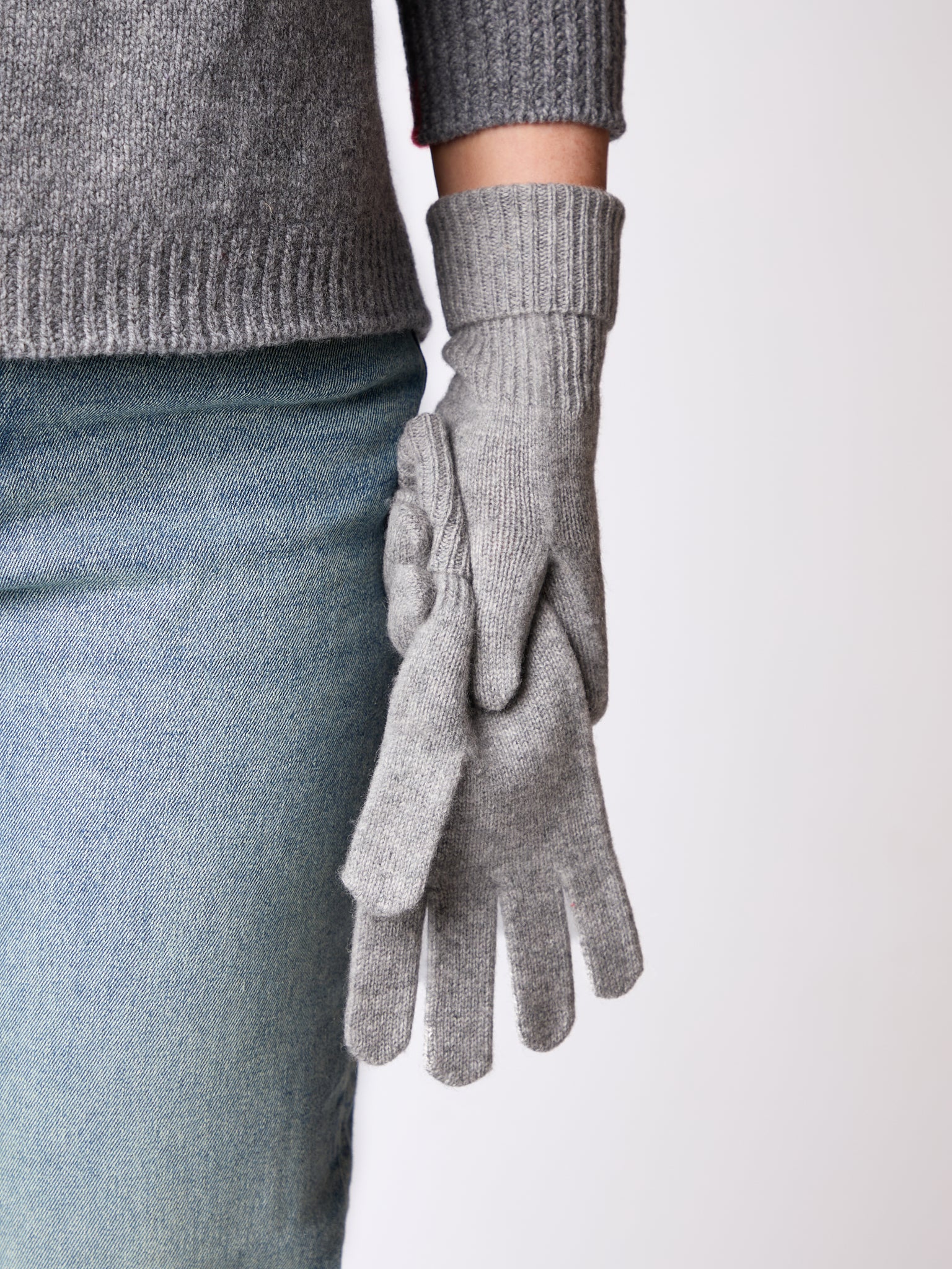 Our unisex grey gloves are crafted from 100% pure cashmere, featuring a ribbed cuff. The insulating texture of cashmere will keep your hands warm and cosy, whether you're commuting to the office or exploring a winter wonderland. These gloves elevate your style while keeping you comfortably shielded from the cold.