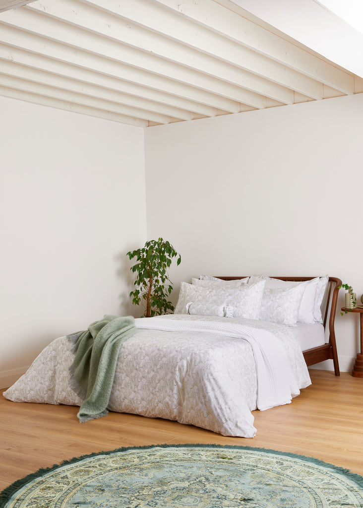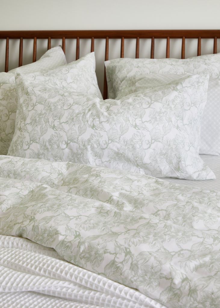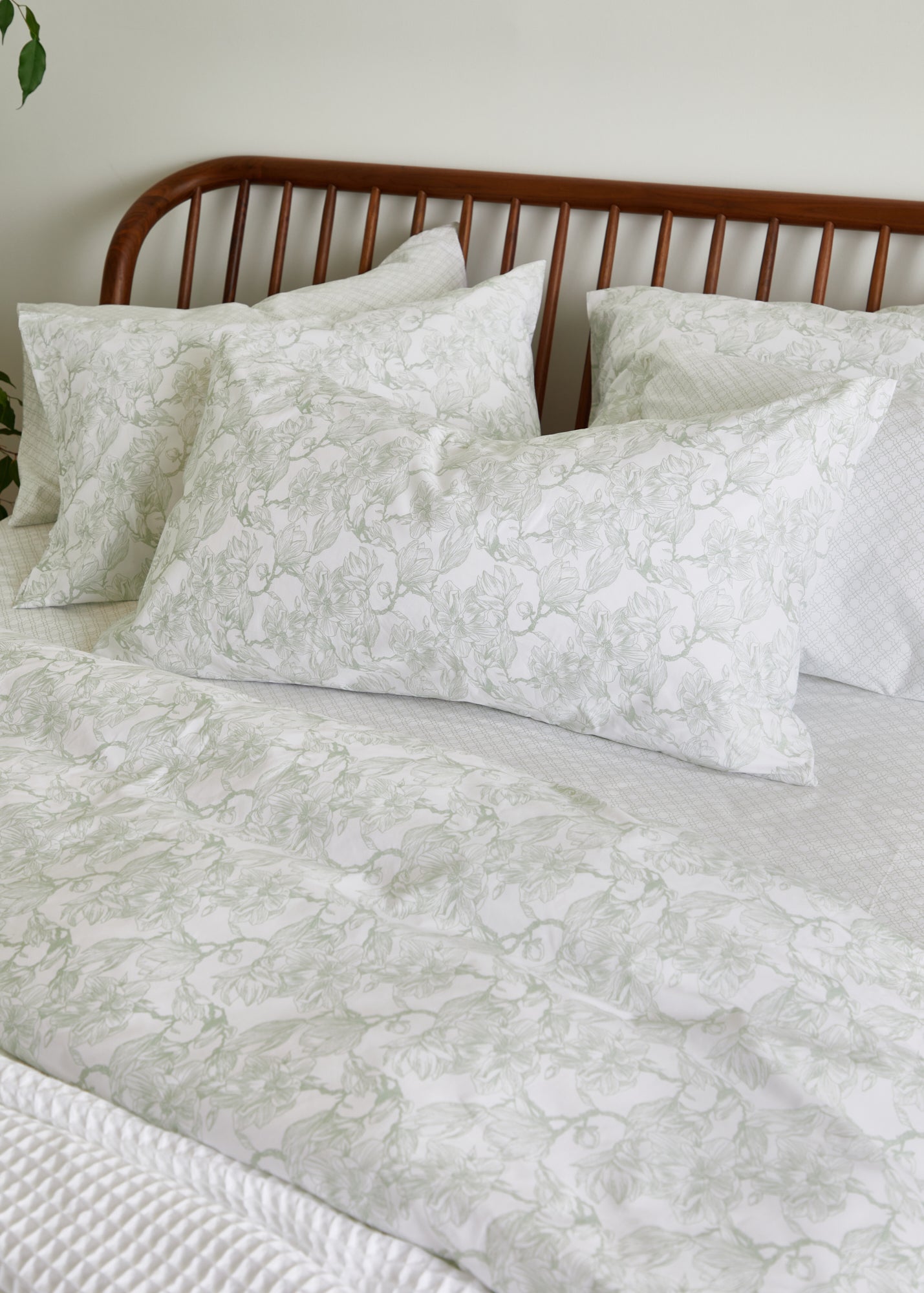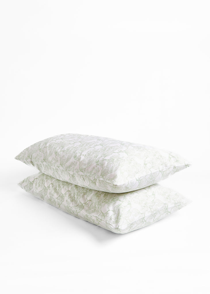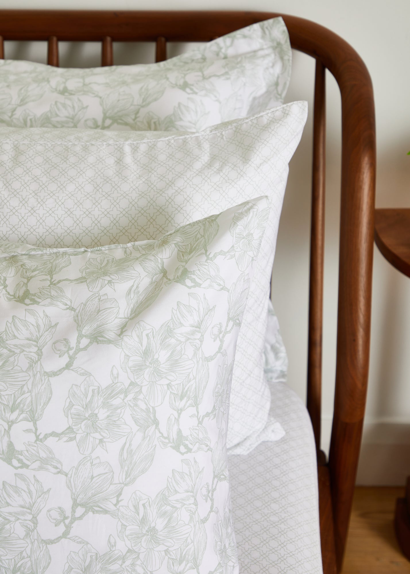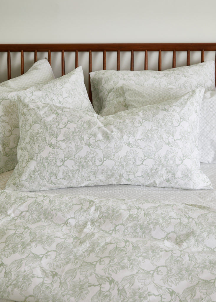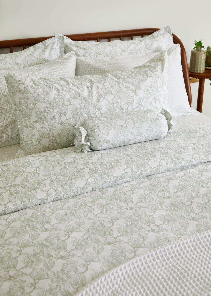 Elevate your bedroom with the Foxford Sage Magnolia King Pillowcase. Crafted from 100% cotton, this pillowcase features a serene sage magnolia pattern that adds a touch of elegance to any decor. Its luxurious texture ensures a comfortable and restful night's sleep. These pillowcases are perfect for king pillows and combine style and comfort for a truly sophisticated bedding experience. Two pillowcases.