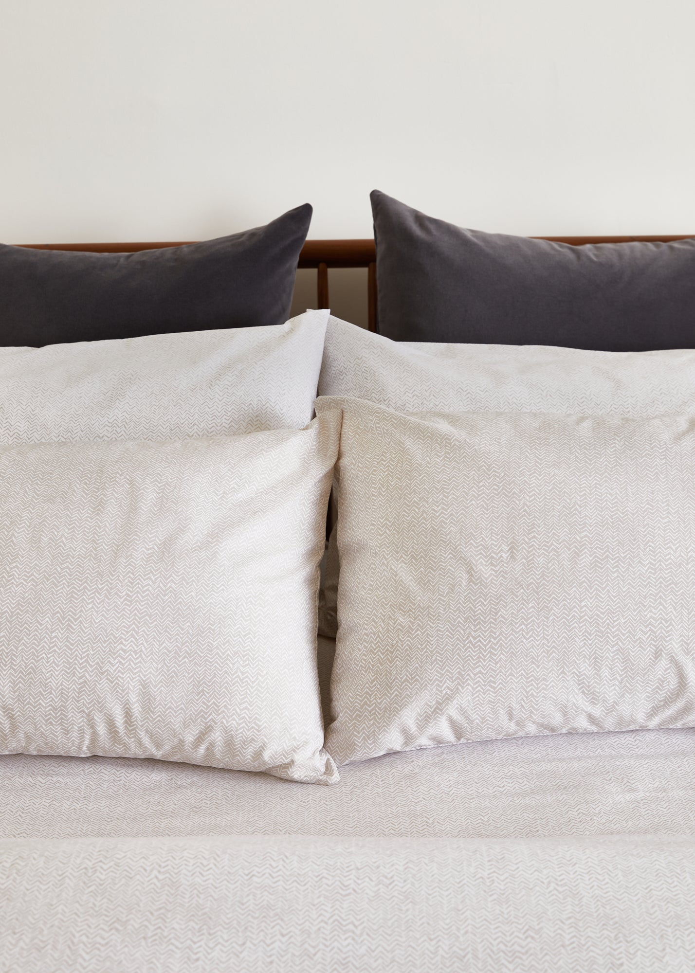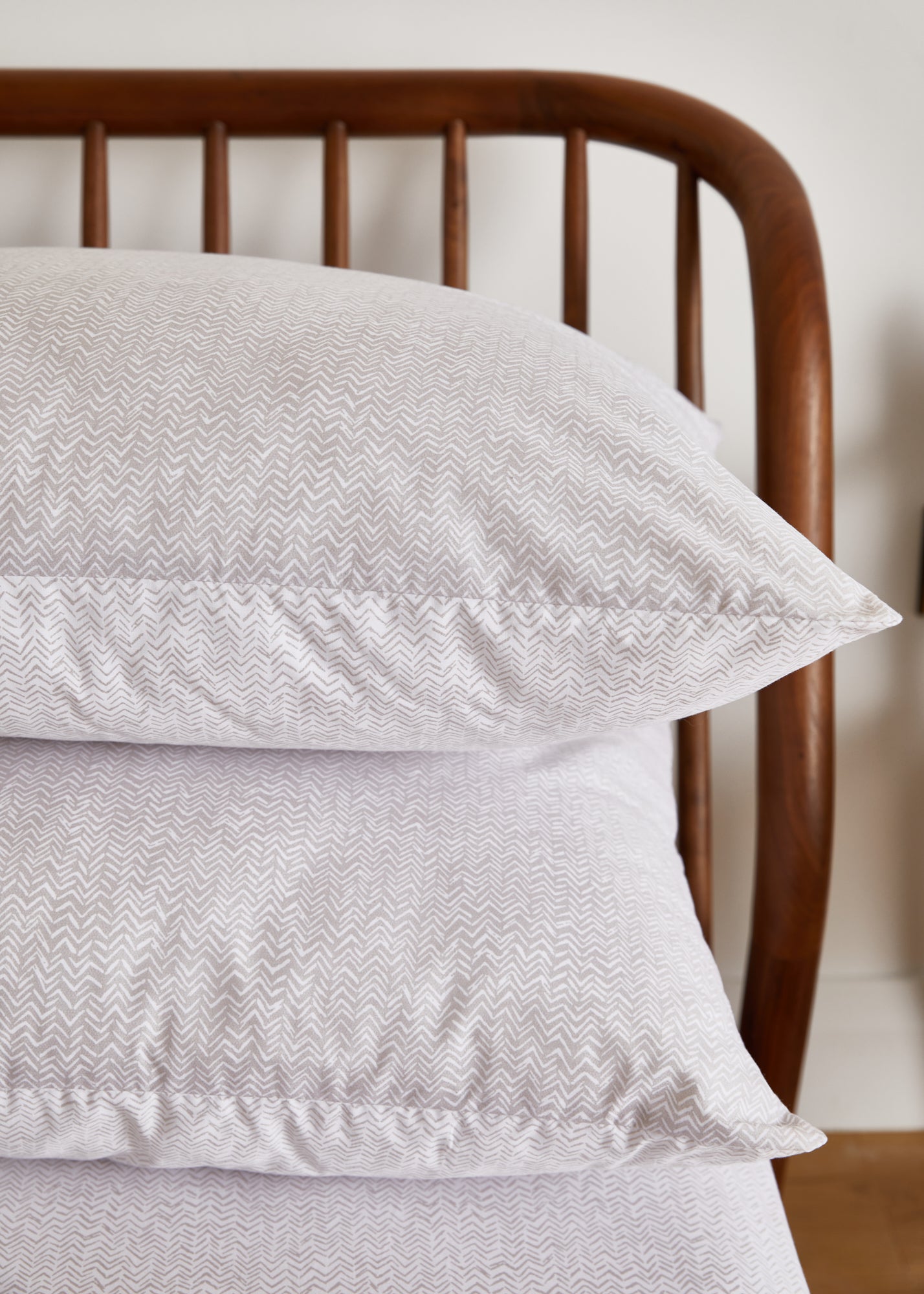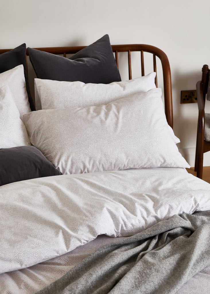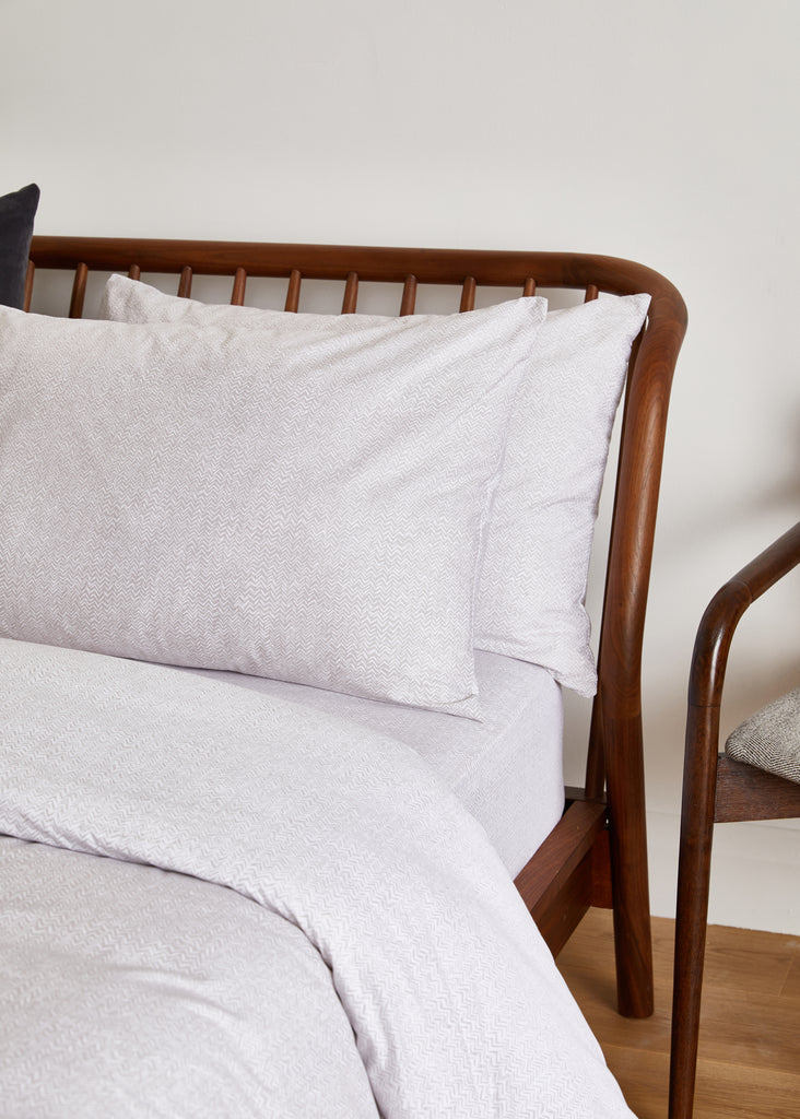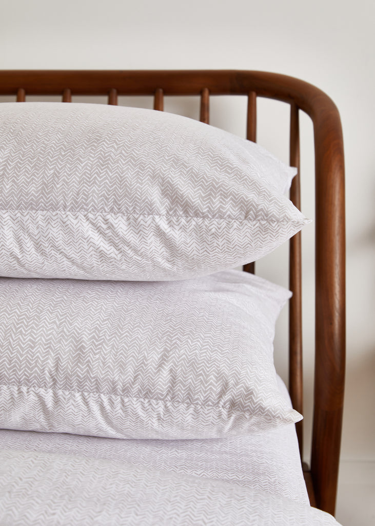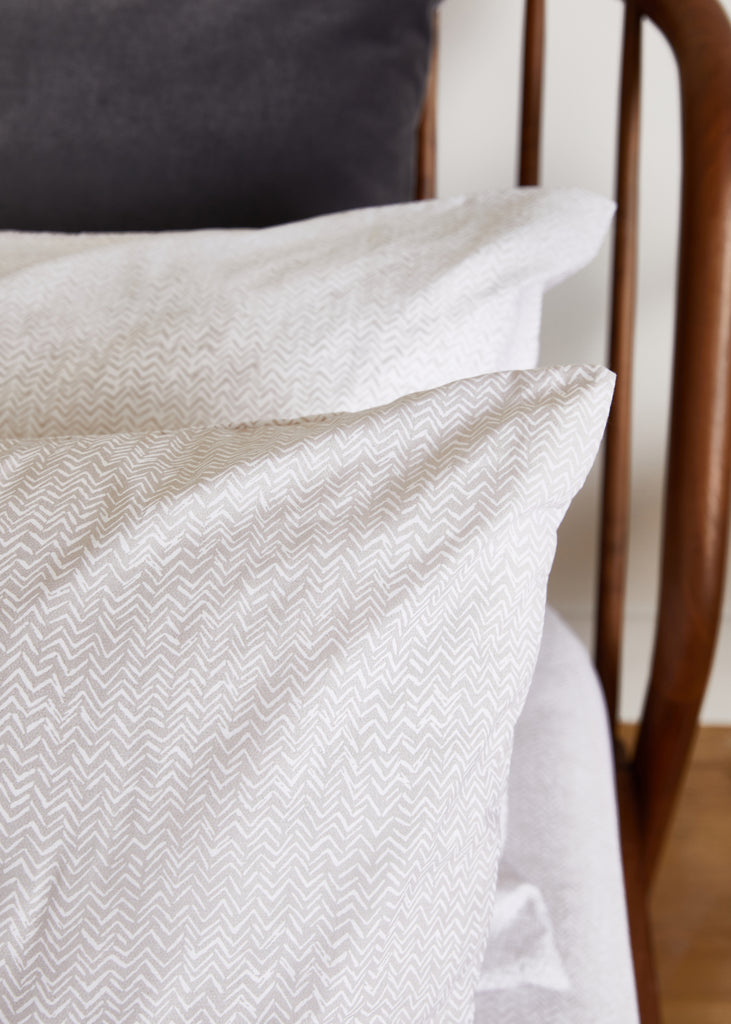 Each piece is expertly crafted in Portugal for superior quality and features a beautiful white chevron on a mink background. This set includes two standard pillowcases from the Everyday Collection, boasting a 180 thread count.