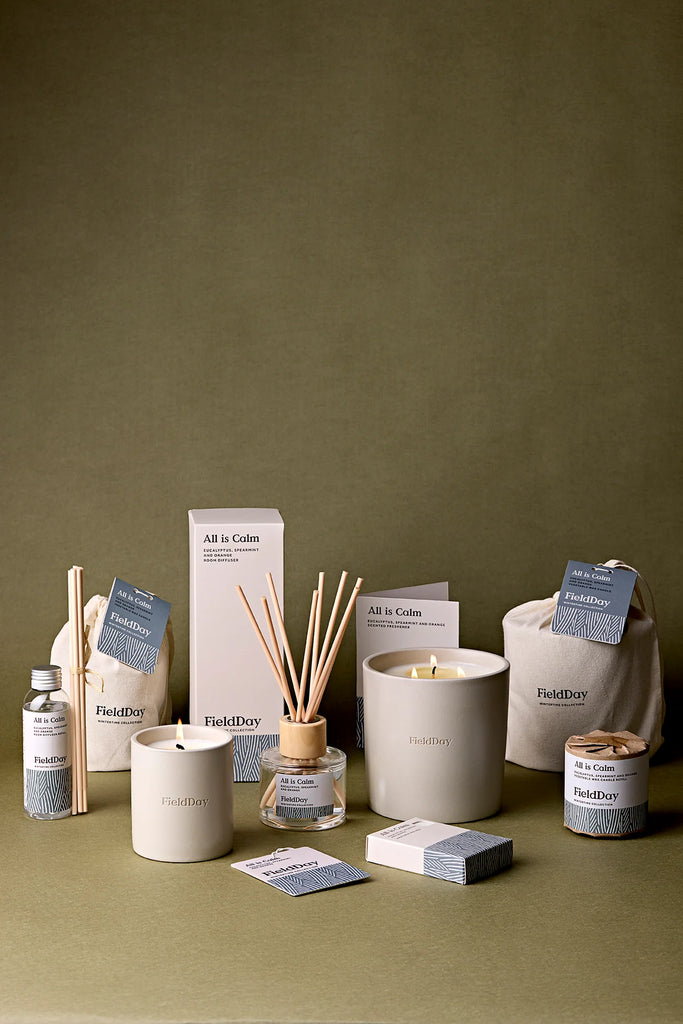 The FieldDay All is Calm Classic Candle features a soothing winter fragrance with notes of eucalyptus, spearmint, and orange. Each large candle is handmade from 100% vegetable wax and poured into a stoneware pot at our rural County Down factory. Supplied with a branded cotton FieldDay bag, it’s ideal for gifting. This vegan and cruelty-free candle offers a burn time of 40 hours and comes in sustainable packaging printed with vegetable inks. Double-poured by hand using planet-friendly palm oil, refills are also available to extend its use.