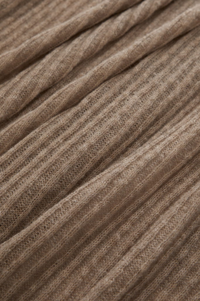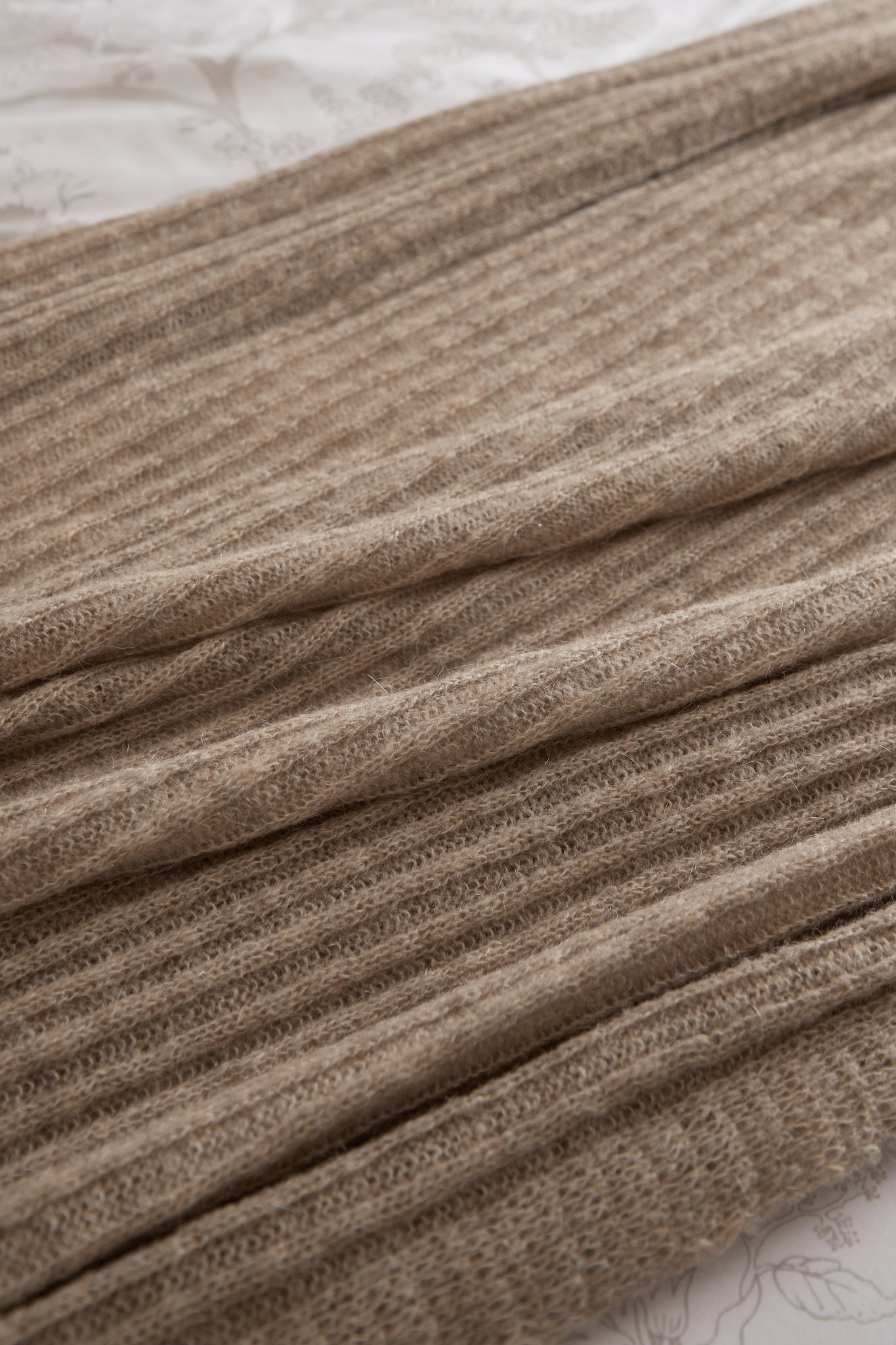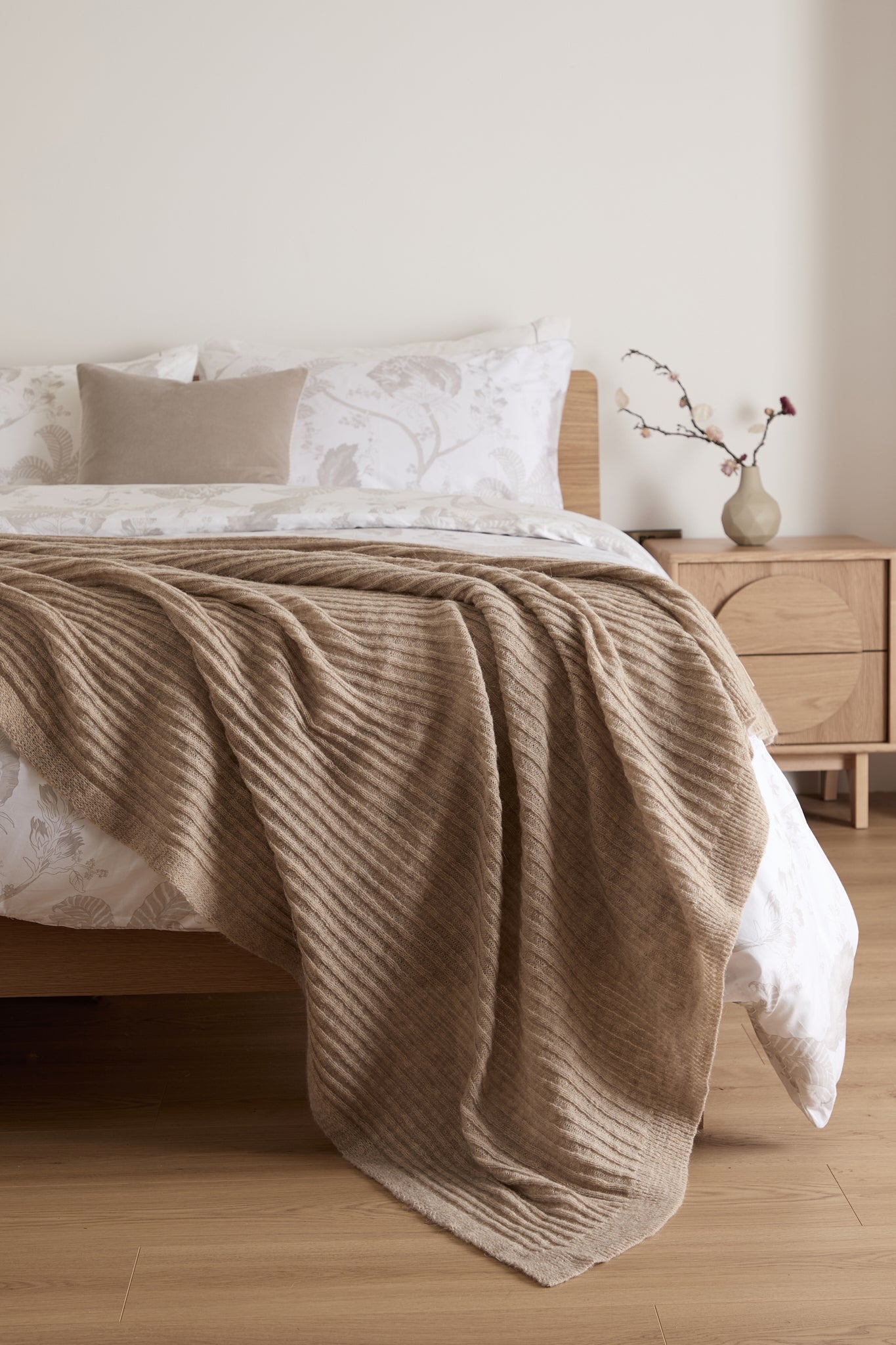 Introducing our knitted bed scarf, crafted from a luxurious mohair blend for ultimate comfort and warmth. Designed in Ireland and expertly woven in Portugal, this 150x200cm ribbed blanket in a soft beige hue adds a touch of elegance to any bedroom. The intricate ribbed texture brings depth and visual interest, while the mohair blend ensures a smooth, cosy feel. This blanket is perfect for layering over your bedding or as a stylish accent piece on your couch, bringing the best Irish design to your home.