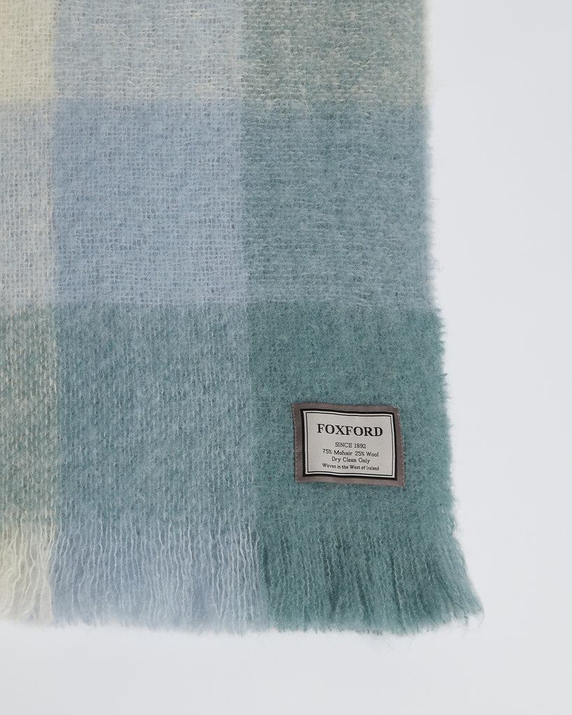 Designed at our County Mayo mill, FOXFORD mohair throws are a fluffier alternative to pure lambswool. Woven in our signature block-check print using light blue and green yarn, the Clew Bay Throw is named after a natural ocean bay in County Mayo. Each throw is finished with a traditional raw edge fringe and individually quality checked before leaving the mill.