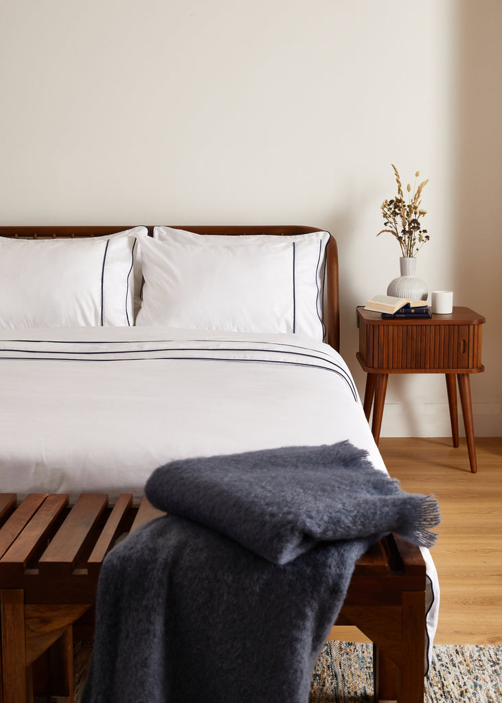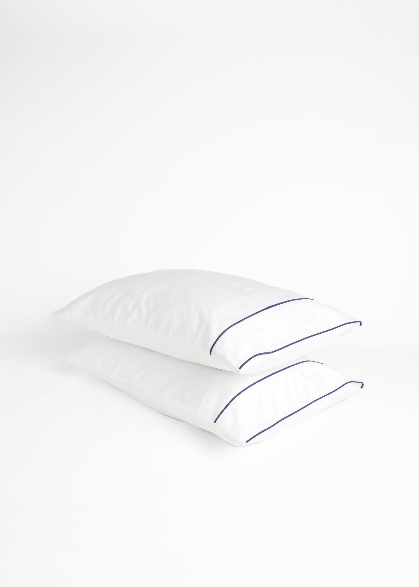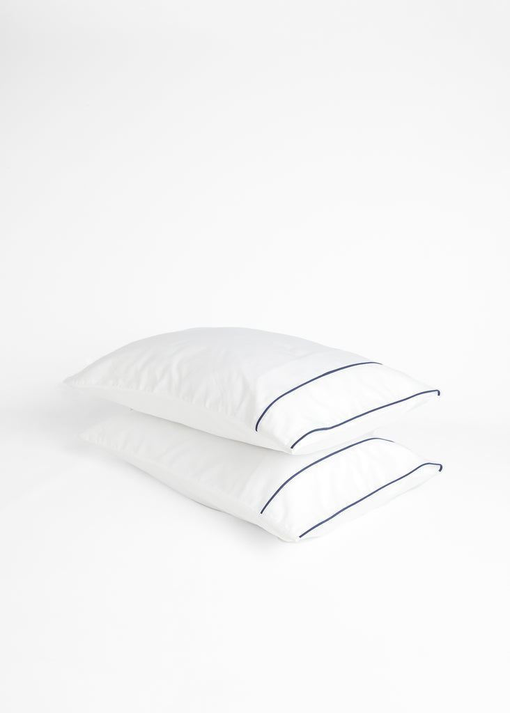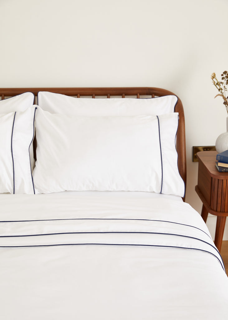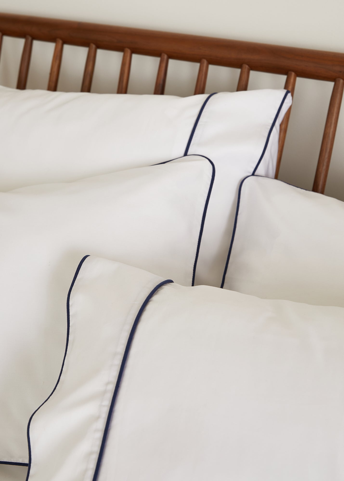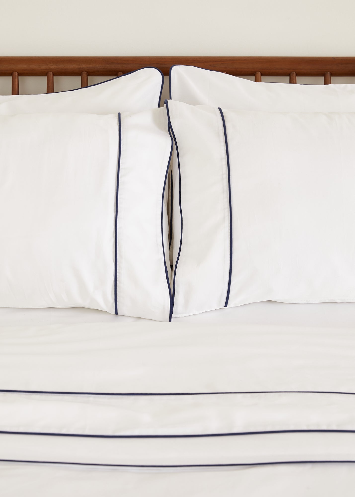 Infuse any bedroom with a vibrant touch using our Cong Standard Pillowcase Set. The edges are adorned with bold navy piping, and each case is skillfully woven with luxurious 400-thread-count sateen cotton for a silky-smooth feel.