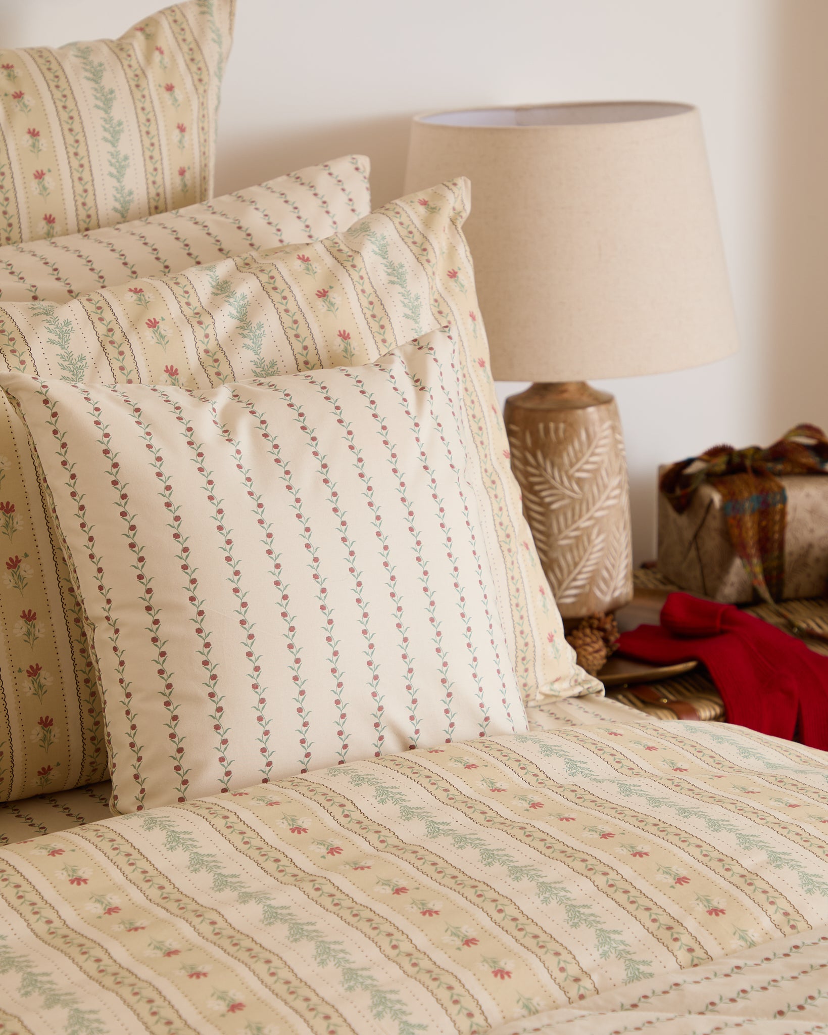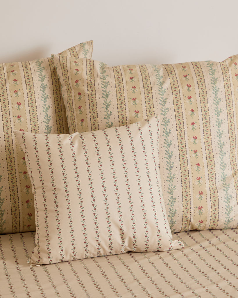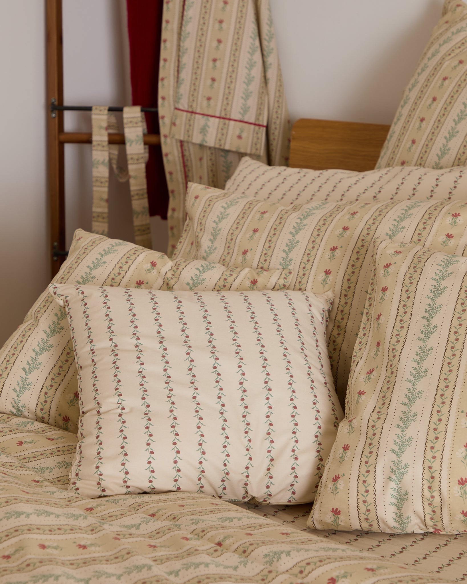 The Foxford Rose Cushion (40 x 40 cm) is a refined addition to the Foxford Rose bedding collection. Crafted from 100% cotton percale with a 180-thread count, it features the signature rose motif in soft, vintage-inspired colours. Its generous dimensions make it perfect for layering, delivering both comfort and sophistication to bedrooms or living spaces. Designed in Ireland and woven in Portugal, this timeless cushion makes a distinctive statement either as part of the Rose range or as a standalone piece.