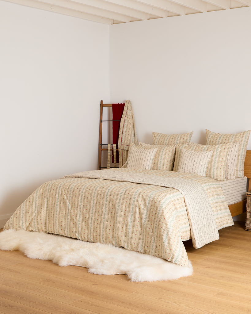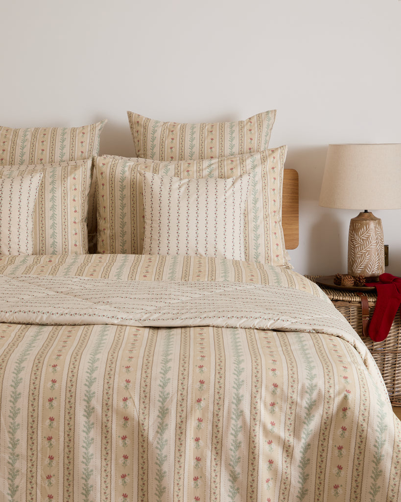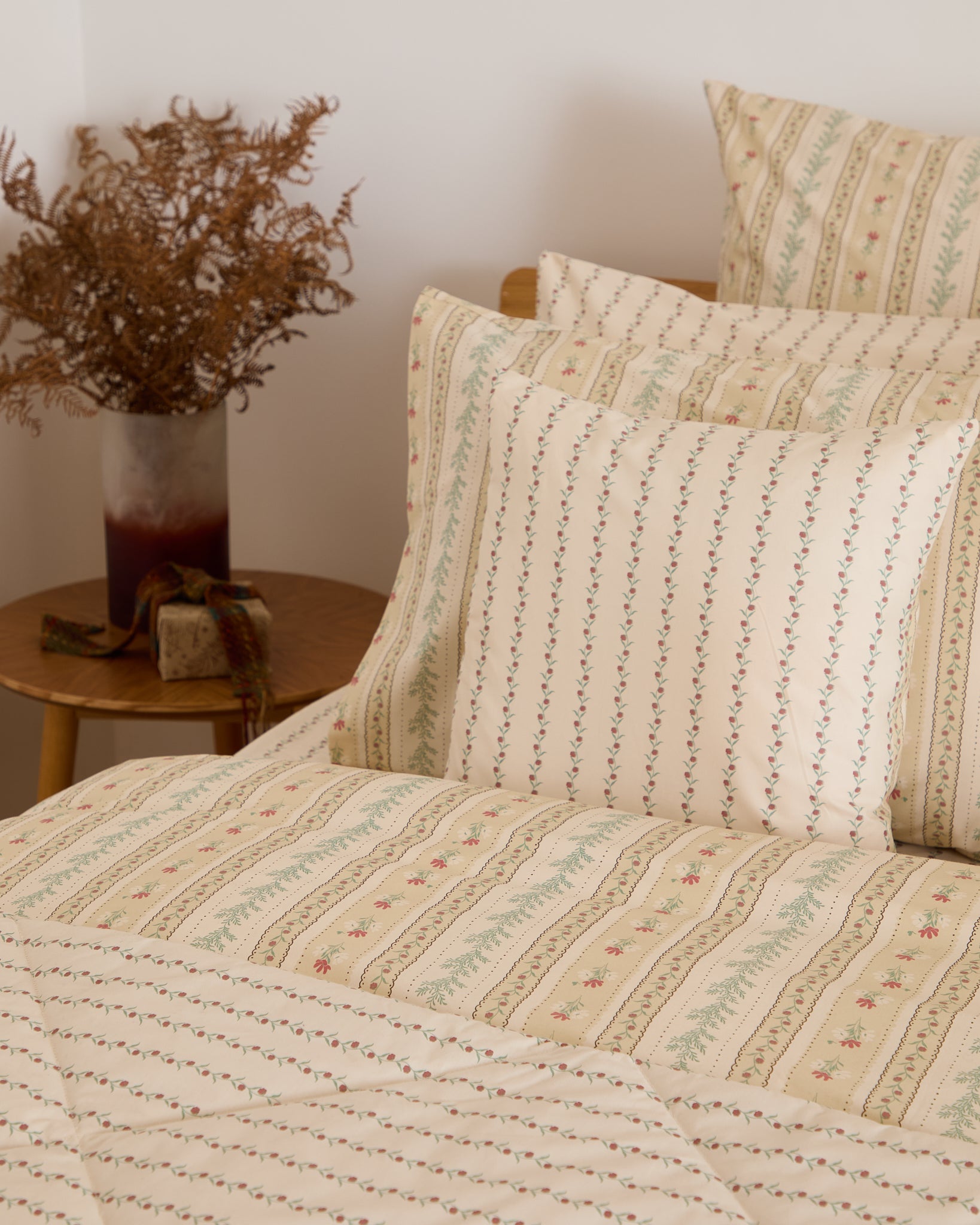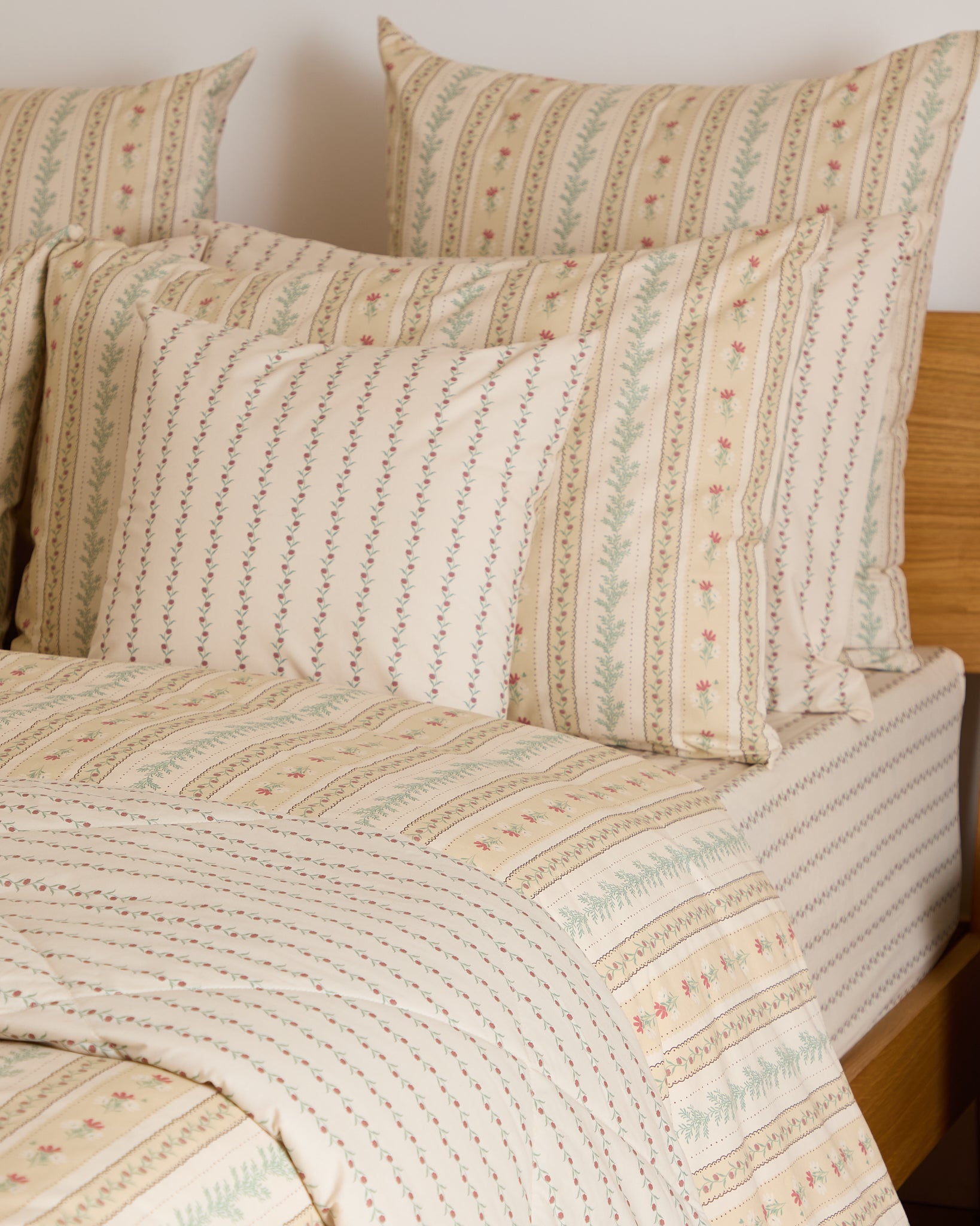 The Foxford Rose Cushion (40 x 40 cm) is a refined addition to the Foxford Rose bedding collection. Crafted from 100% cotton percale with a 180-thread count, it features the signature rose motif in soft, vintage-inspired colours. Its generous dimensions make it perfect for layering, delivering both comfort and sophistication to bedrooms or living spaces. Designed in Ireland and woven in Portugal, this timeless cushion makes a distinctive statement either as part of the Rose range or as a standalone piece.