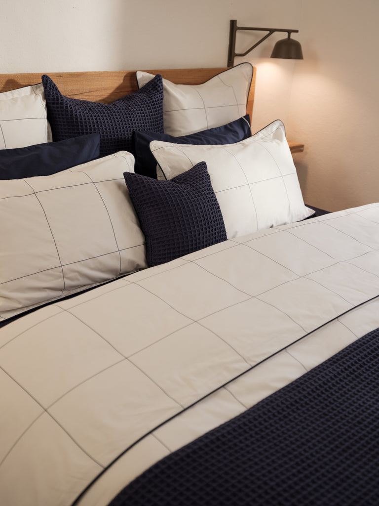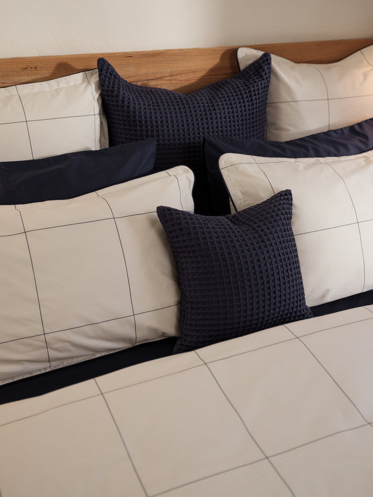 Discover the elegance of our Foxford Navy Honeycomb Cushion, a must-have for enhancing your bedroom. Crafted from 100% cotton, it perfectly balances cosiness and sophistication. At 65x65cm, it's a versatile choice for staying cosy or adding a touch of vibrancy to your bedding.