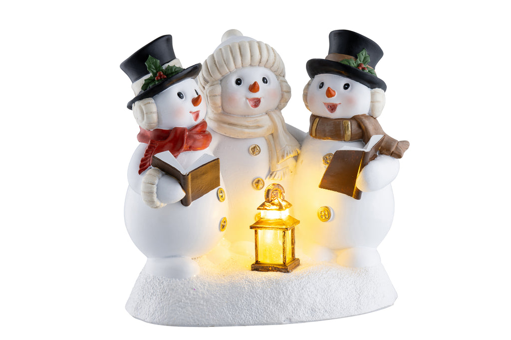 The Aynsley Trio of Snowman Carol Singers LED Figurine includes three light-up snowmen singing carols. This festive decoration adds a warm glow and holiday spirit to any room, perfect for mantels or tables. Durable and detailed, it brings classic Christmas charm to your home.