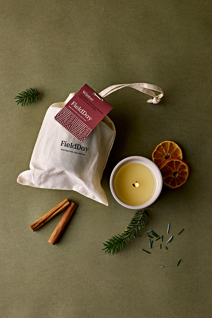 The Winter Classic Candle is a large, handcrafted vegetable wax candle housed in a 100% stoneware pot. It features fragrance notes of cinnamon, clove, and orange, delivering a warm, inviting scent. Each candle is presented in a branded cotton FieldDay bag and produced at our factory in rural County Down. With a burn time of approximately 40 hours, it is vegan-friendly, cruelty-free, and uses sustainable packaging printed with vegetable inks. This double-poured candle utilizes planet-friendly palm oil.