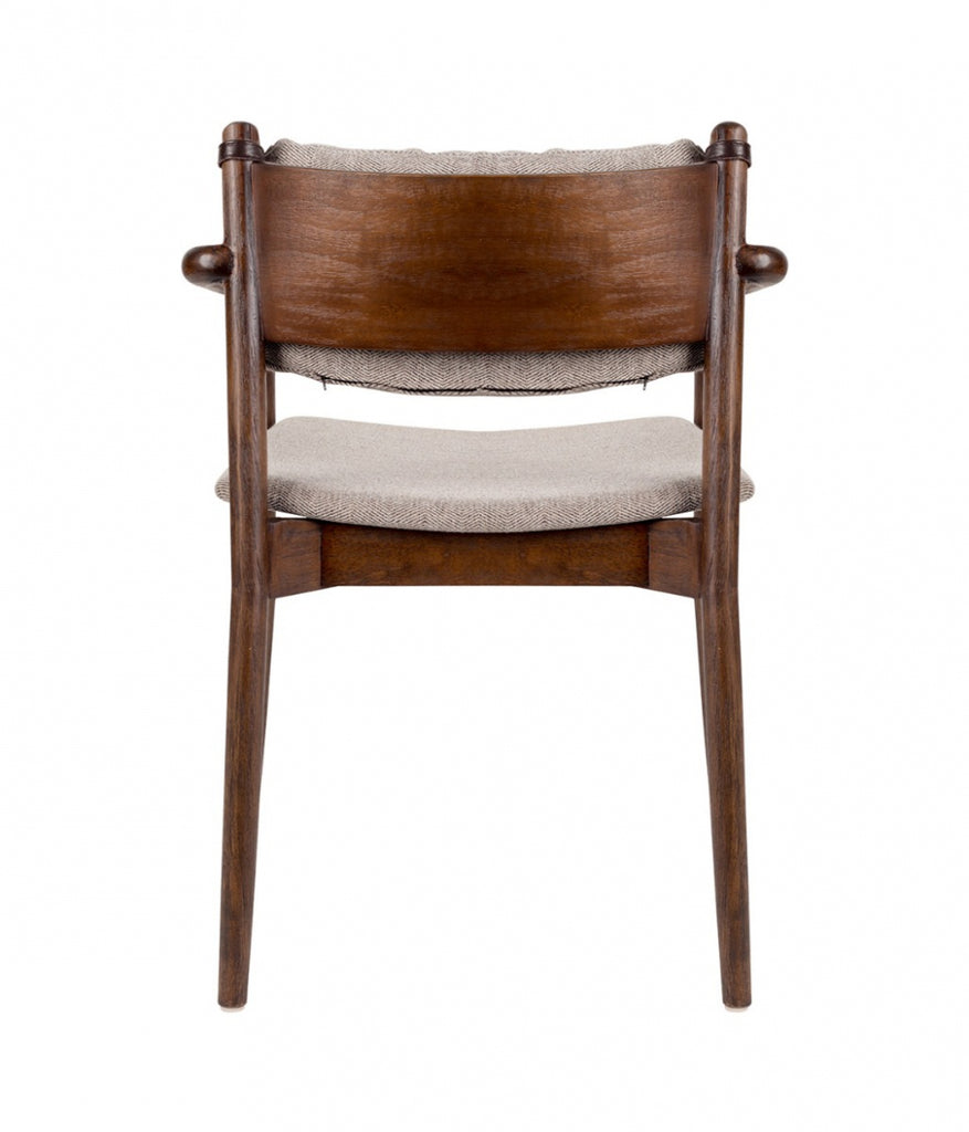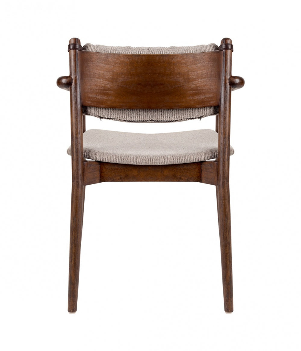 100% polyester fabric with herringbone pattern 30.000 martindale, colour fastness 4, plywood seat with pu-foam, density 30, removable back cushion with fibre filling, solid rubberwood frame with brown lacquered acacia back
