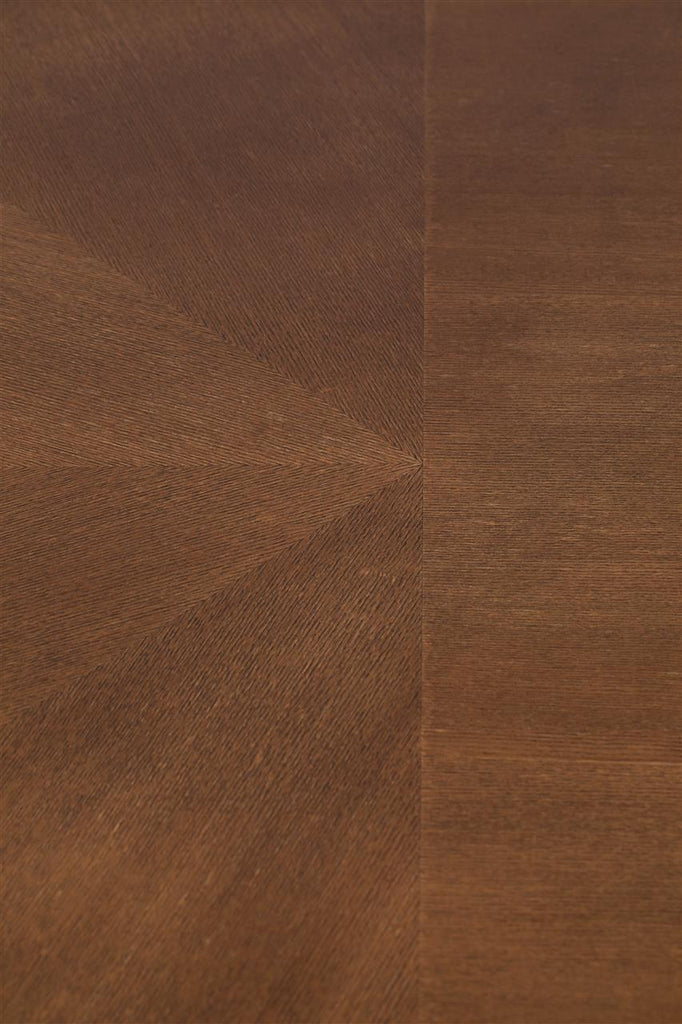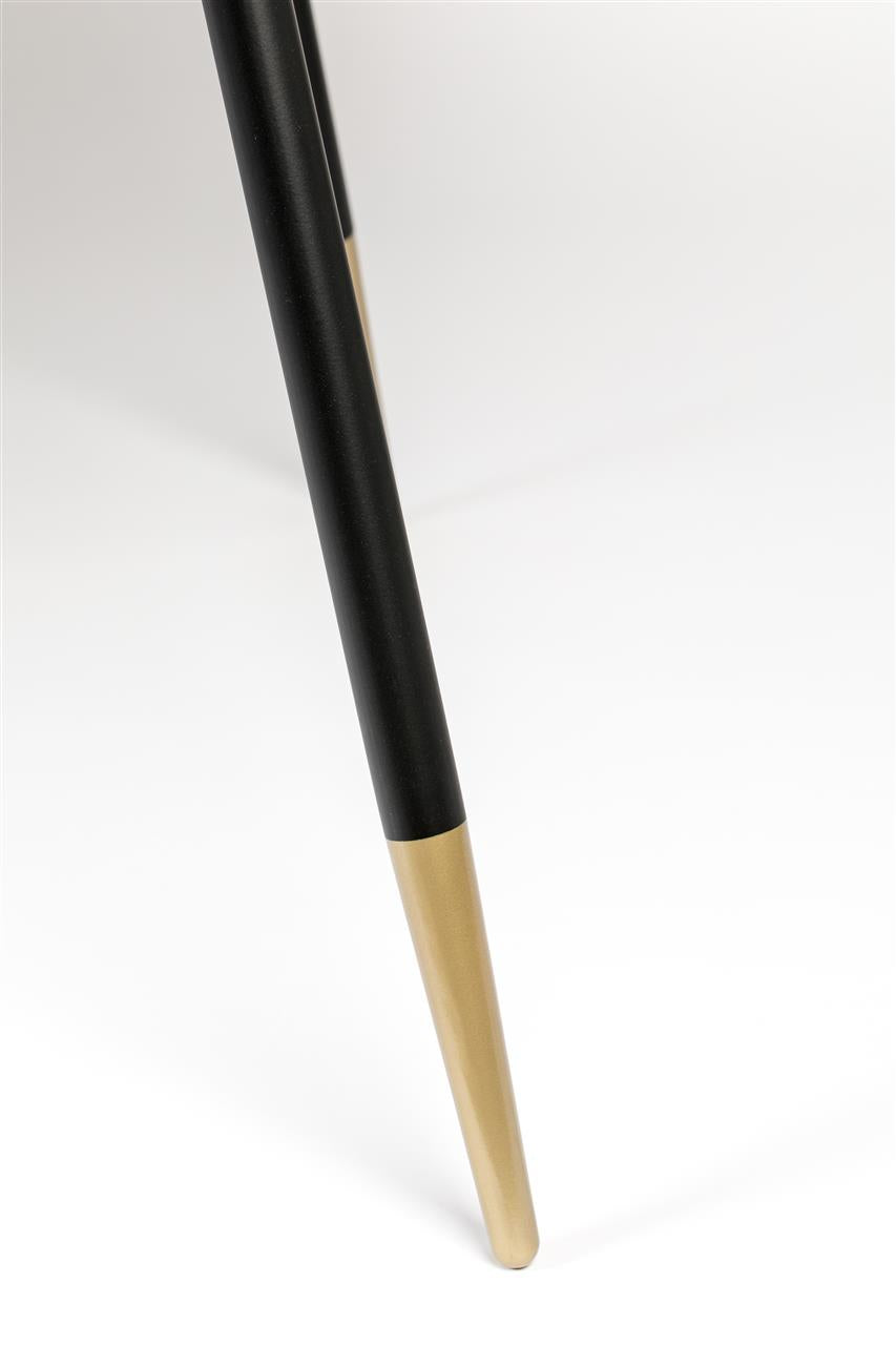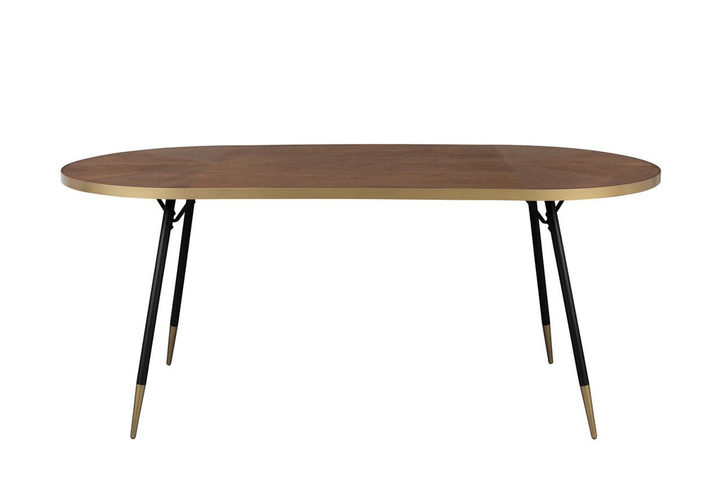 The Denise dining table impresses with its refined charm, distinguished by the graceful interplay of oval curves, slender legs, and a sophisticated palette of gold, light wood, and black. This table artfully combines various materials including a walnut-toned veneer surface, slim black iron legs, and striking gold details making Denise a captivating focal point in any dining setting.