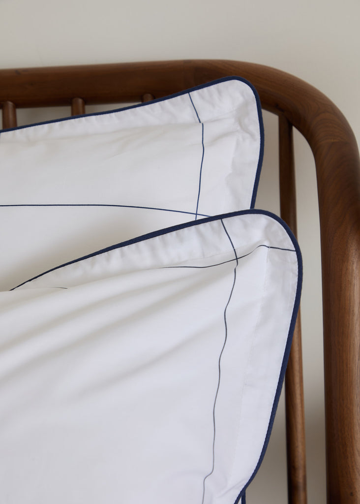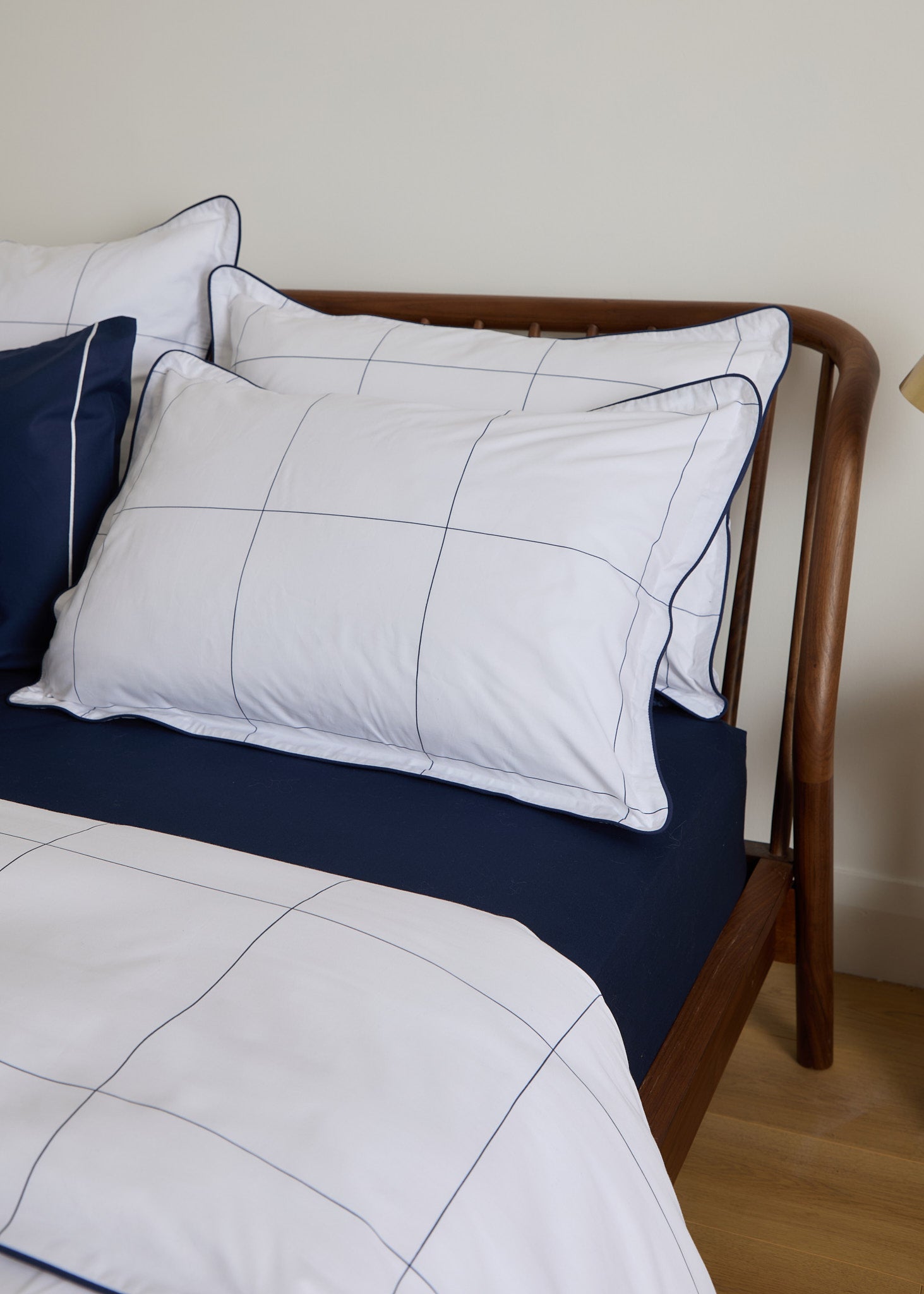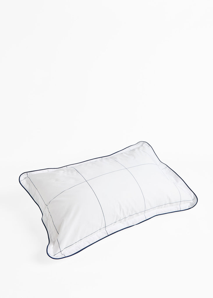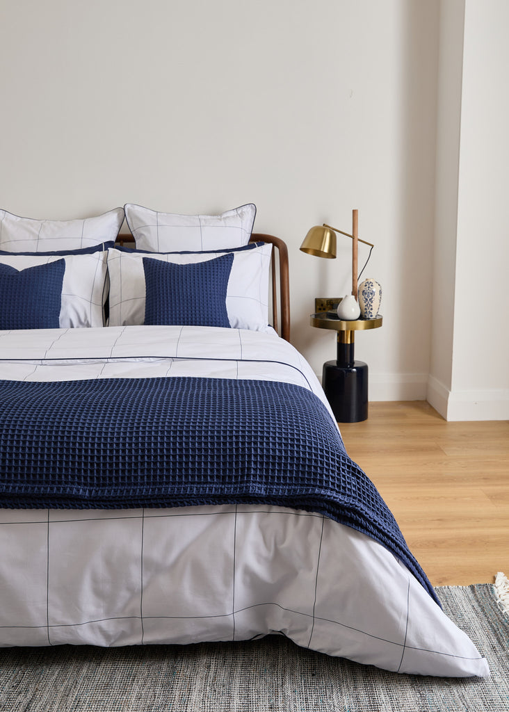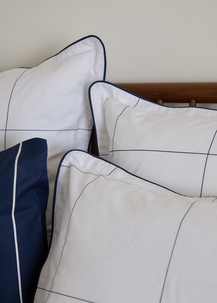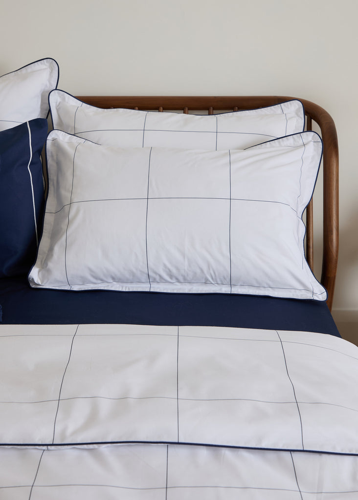The Foxford Navy Windowpane Oxford Pillowcase features a classic navy windowpane print and is part of a crisp white bedding set.