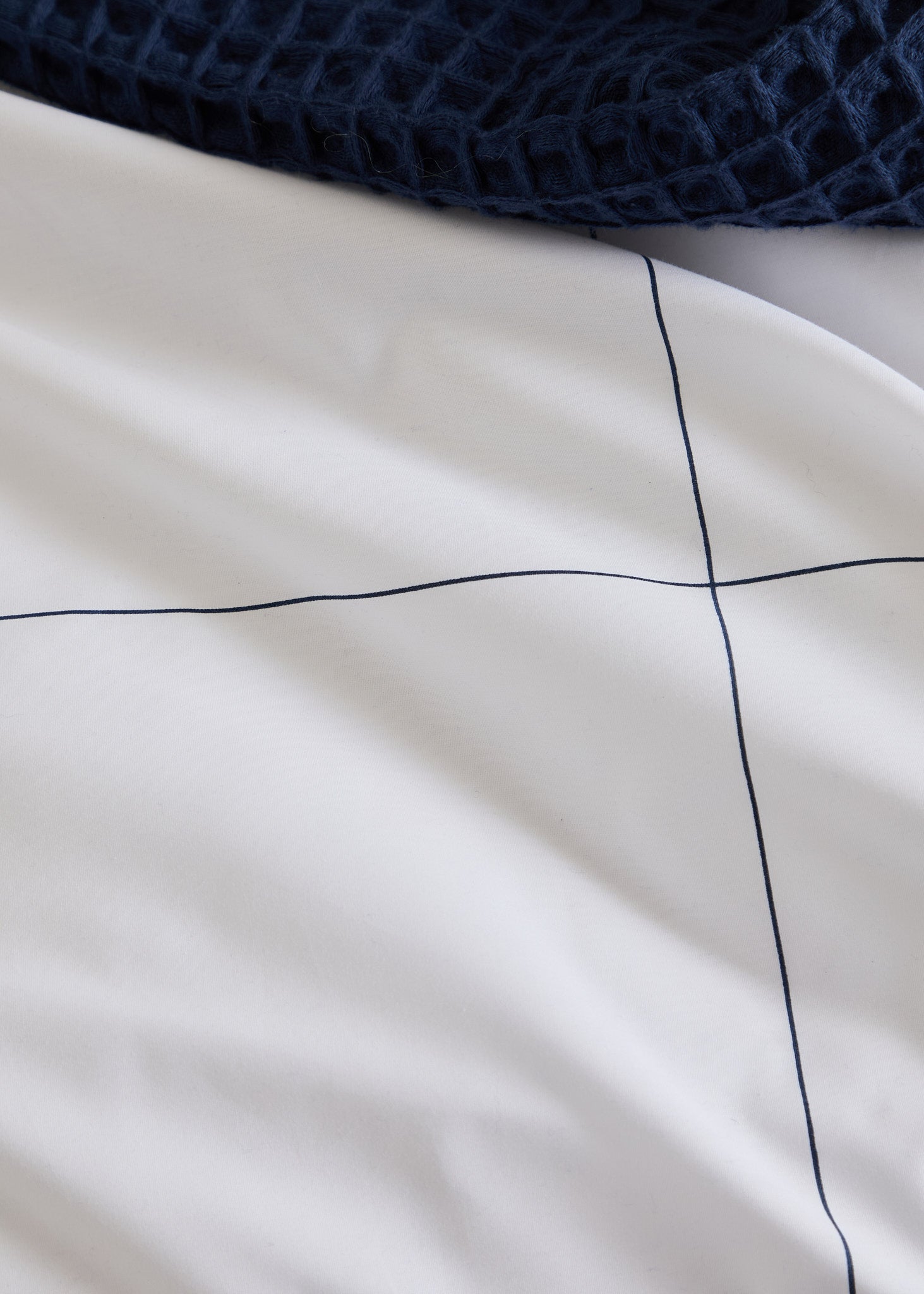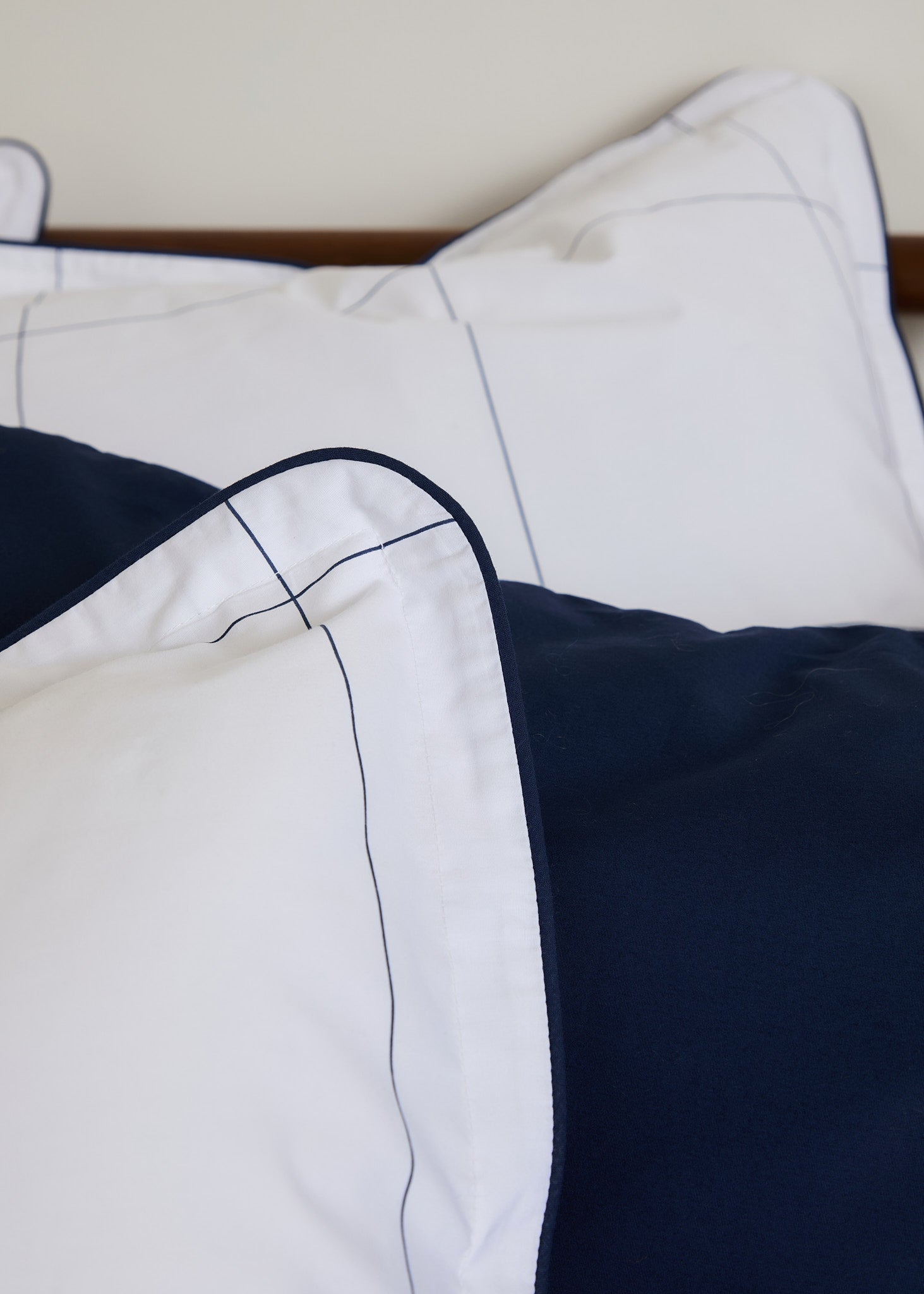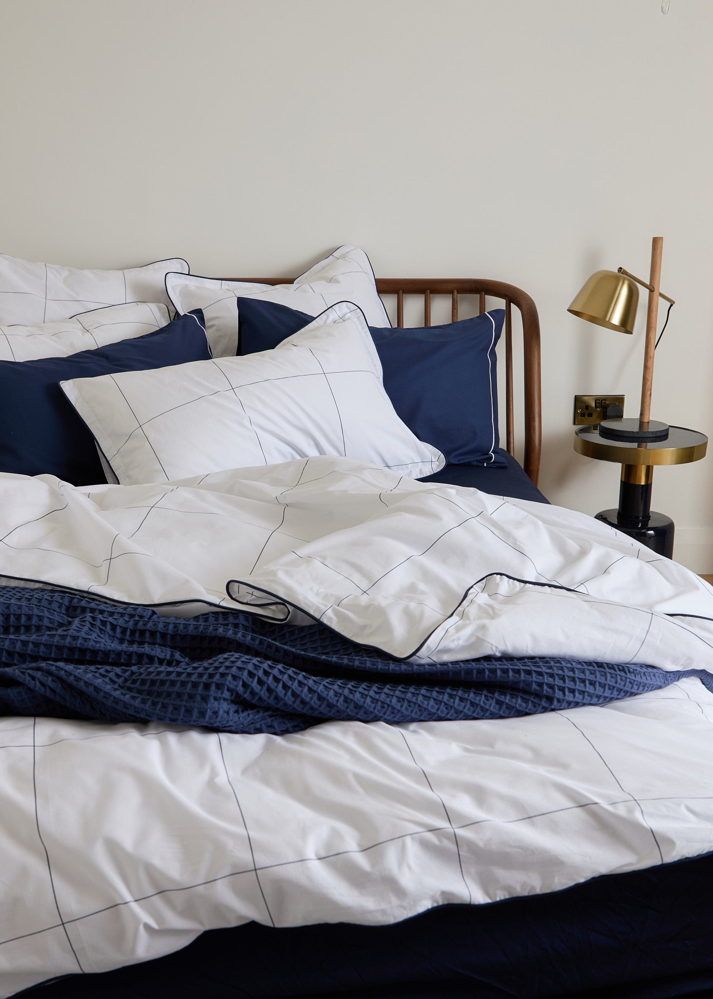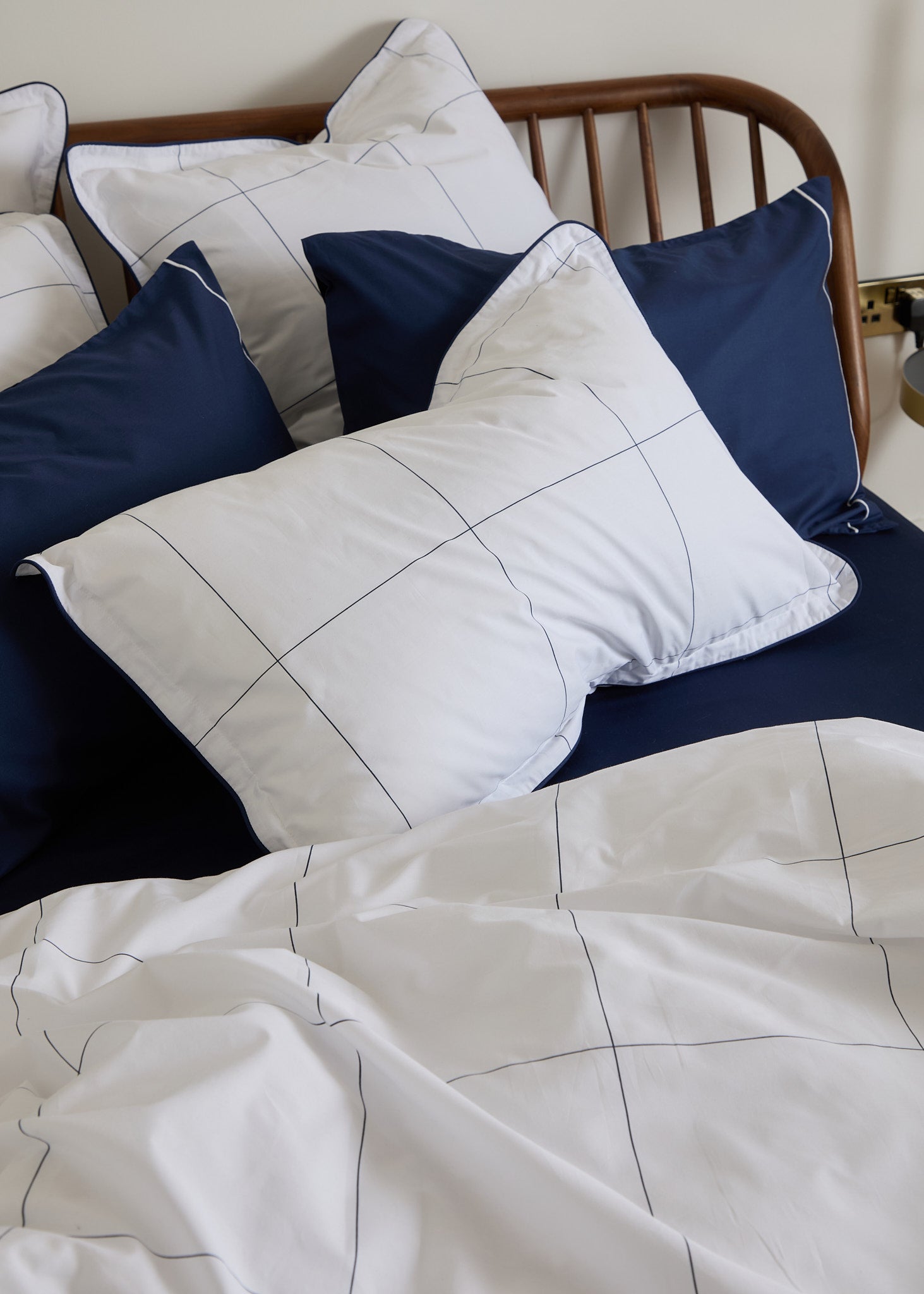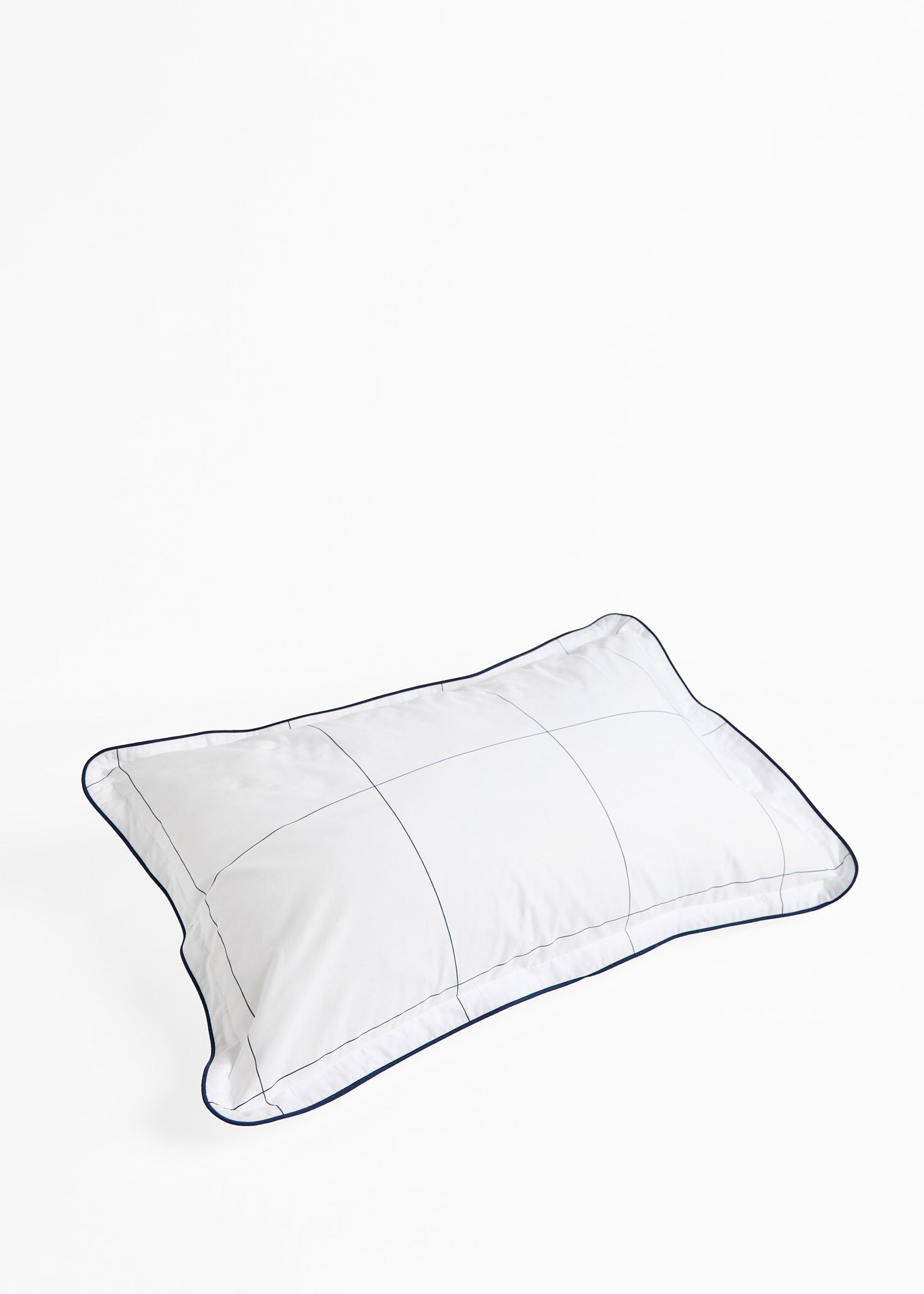 The Foxford Navy Windowpane Oxford Pillowcase features a classic navy windowpane print and is part of a crisp white bedding set.