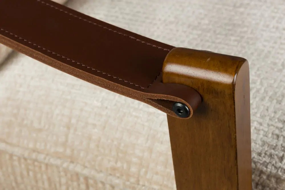 Elevate the ambiance of your seating area with the luxurious Dutchbone Washington Lounge Chair. Crafted with a sophisticated walnut finish wooden frame, this armchair boasts beautifully contrasting leather armrests and plush fabric cushions for a comfortable and stylish experience. Inspired by the cozy feel of a fifties interior, this chair exudes a vintage charm with its subtle woven pattern. Made with high-quality materials, including mango wood and soft upholstery, this armchair is the perfect addition to any space.
