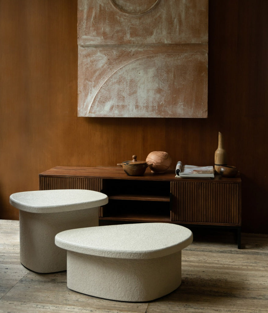 Transform your interior with the unique Dutchbone Veda collection. These wall cabinets and tables boast playful, organic shapes and a warm, recycled marble material. Available in various shapes and sizes, this collection adds instant character to any room while creating a cosy, inviting atmosphere. Choose from a coffee table, side table, or wall shelf to add a distinctive touch to your space.